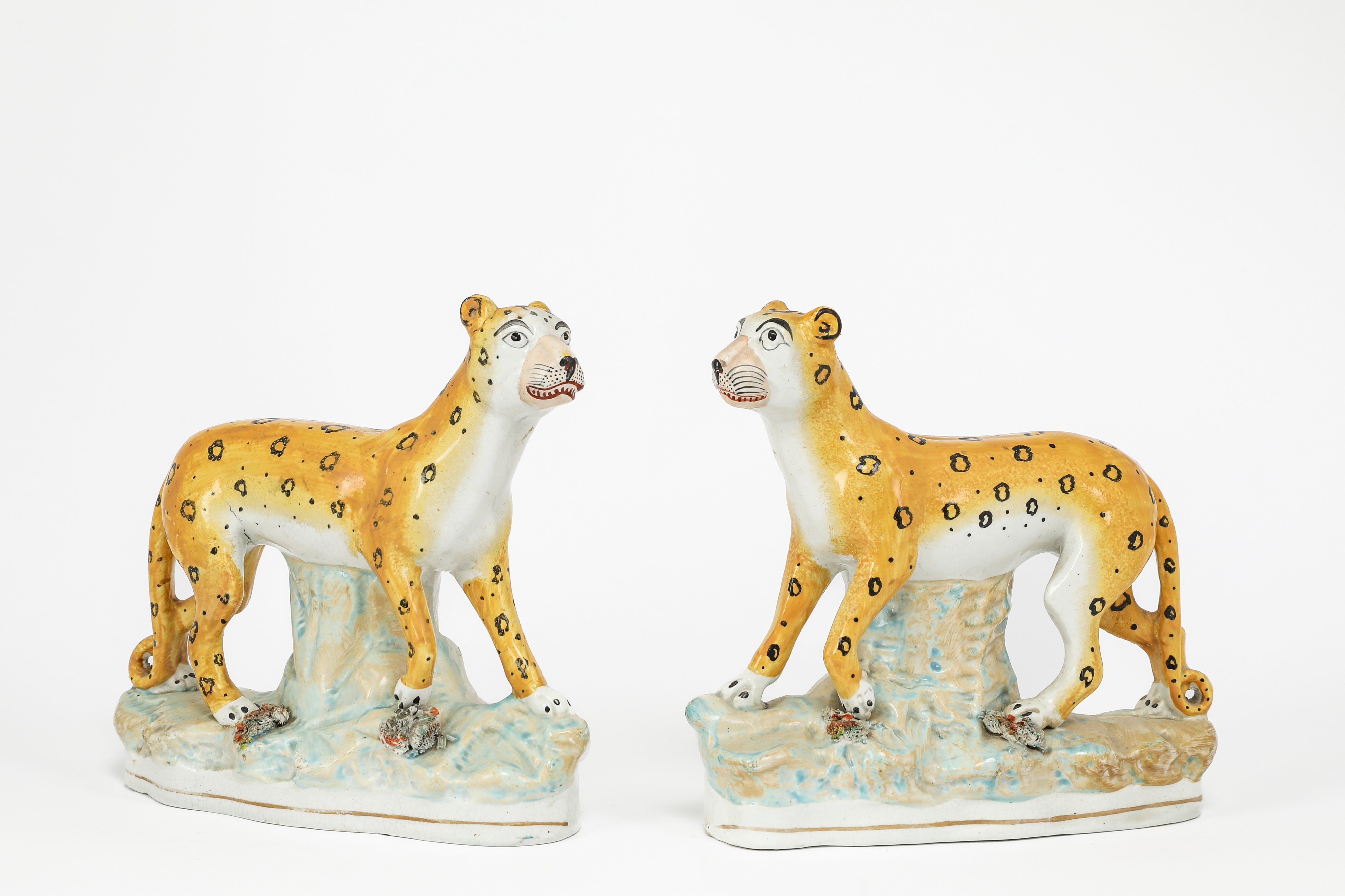 A RARE PAIR OF STAFFORDSHIRE LEOPARDS