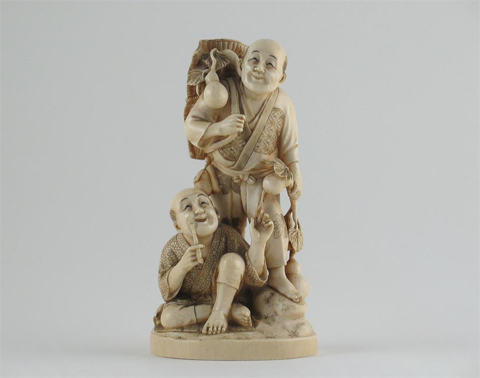A Japanese ivory carving of two figures, one carrying a basket full of gourds, his companion seated, an inset red lacquer signature. Minor damages. Meiji 1868-1912, 18.5cm.