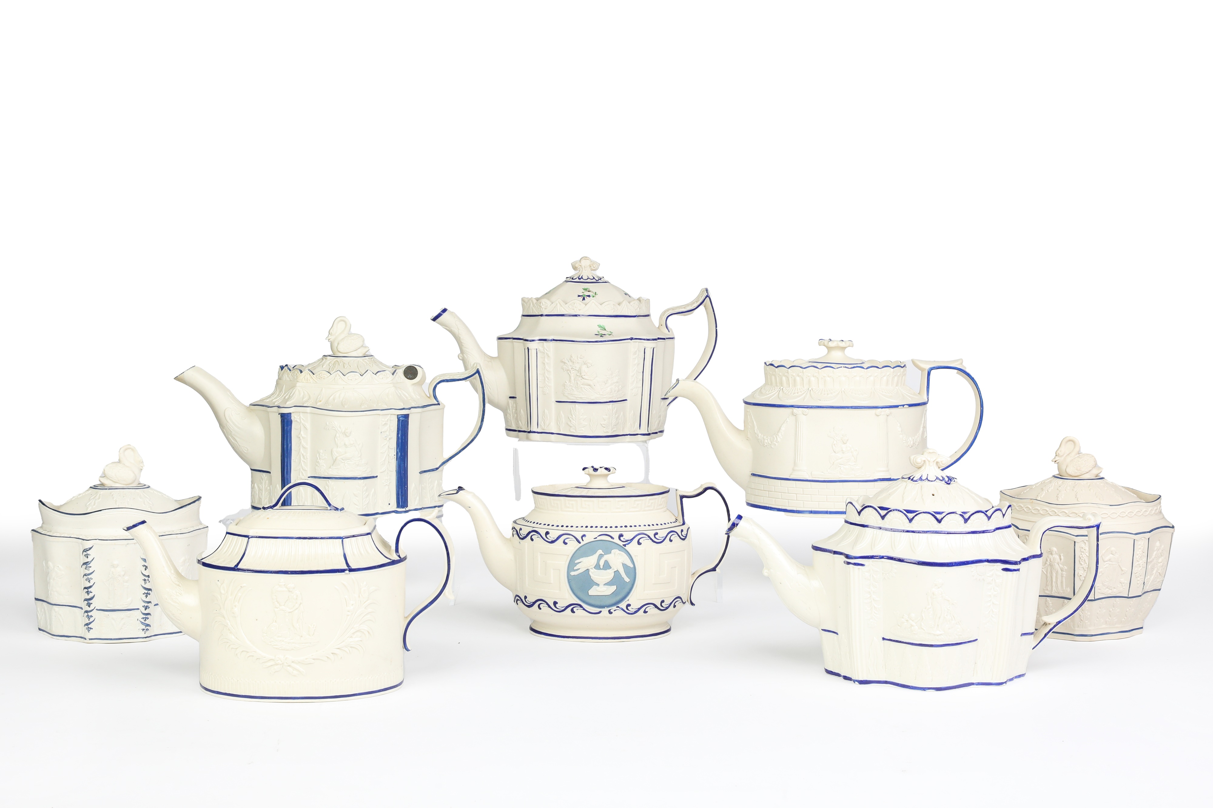 all with covers and one hinged, variously decorated with classical figures and motifs, one with roundels depicting birds on a vase, three teapots with impressed numbers (15)