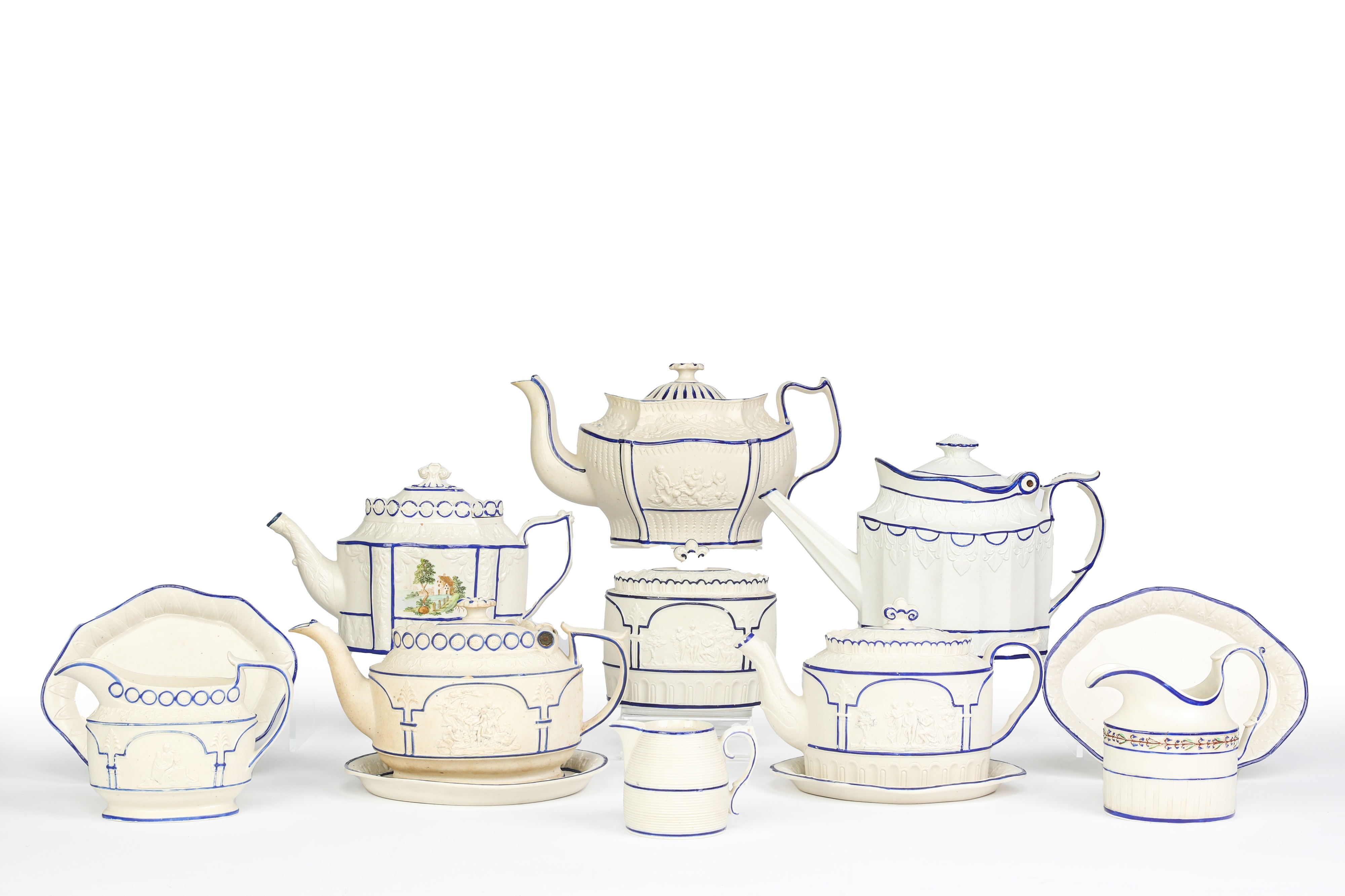 comprising: five teapots and covers, the large teapot with a hinged lid marked Heath & Son; four oval stands; a sugar basin and cover; and three jugs, decorated with classical figures, one with a pastoral landscape, others with formal borders (17)