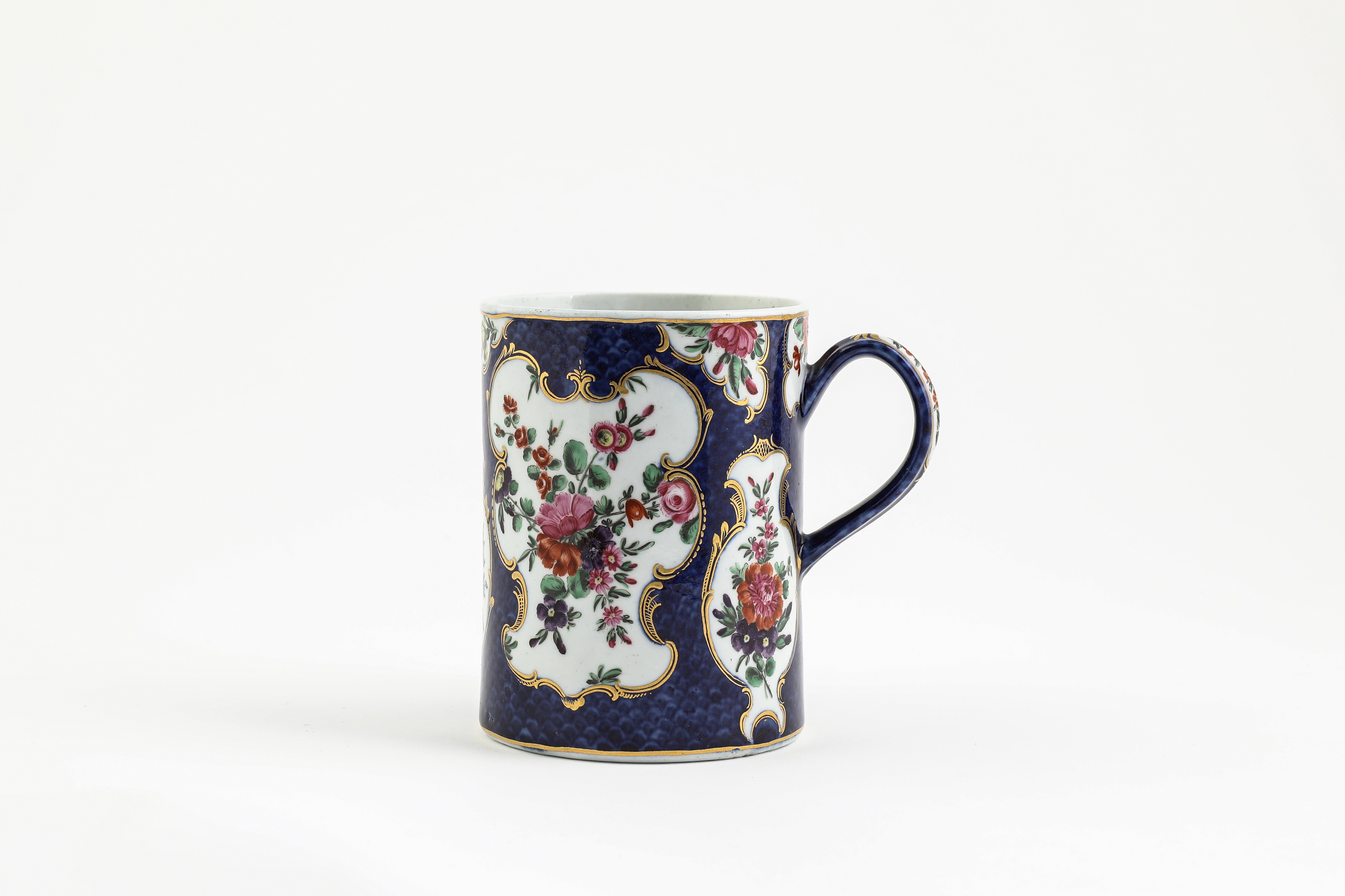 the cylindrical body painted with panels of flowers and sprigs reserved within gilt 'C' scroll borders on a blue scale ground