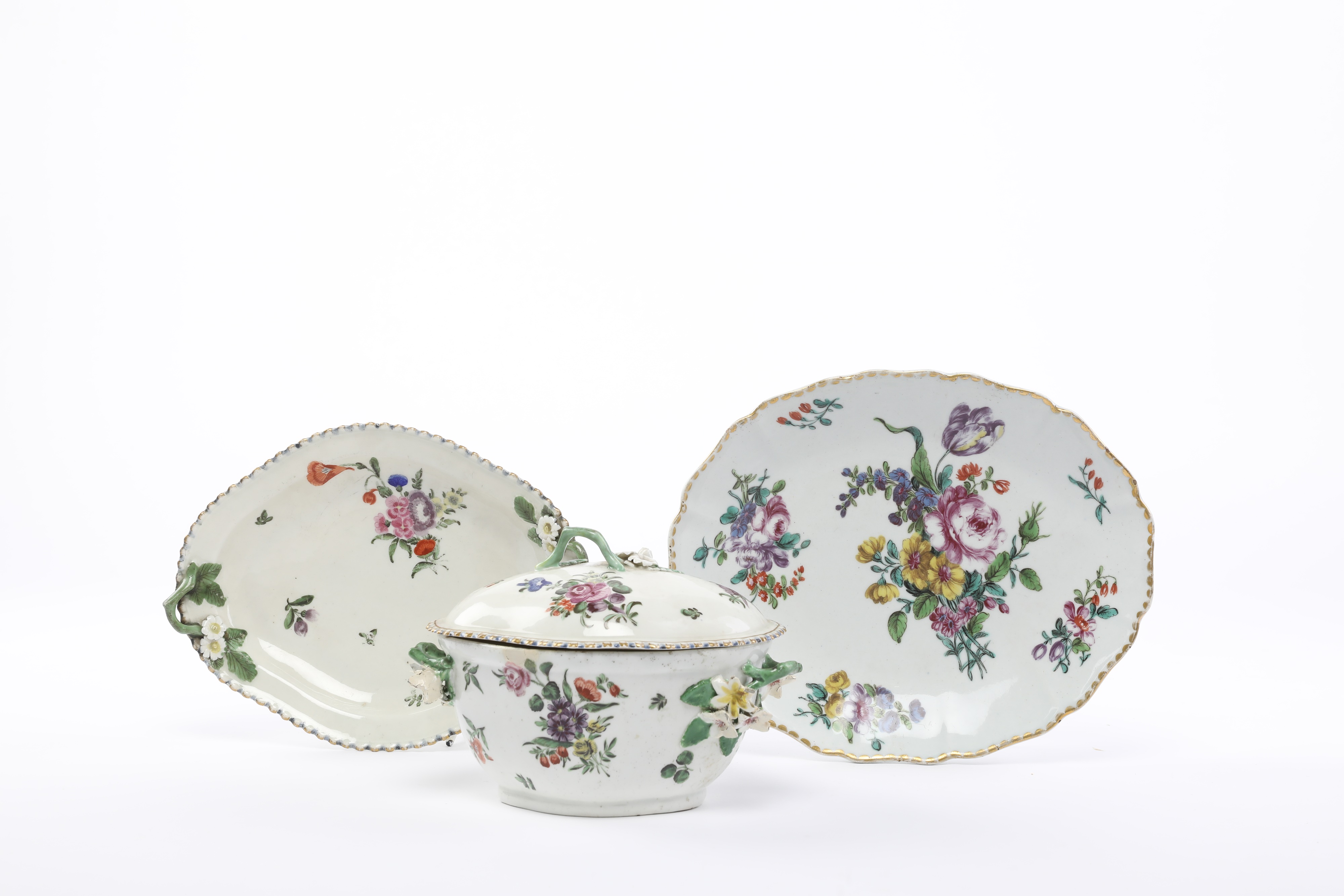 of quatrelobe form, painted with floral sprays between flower twig handles, together with a Bow oval dish, c.1760-76, painted with deutsche blumen, iron red dagger and anchor (4)