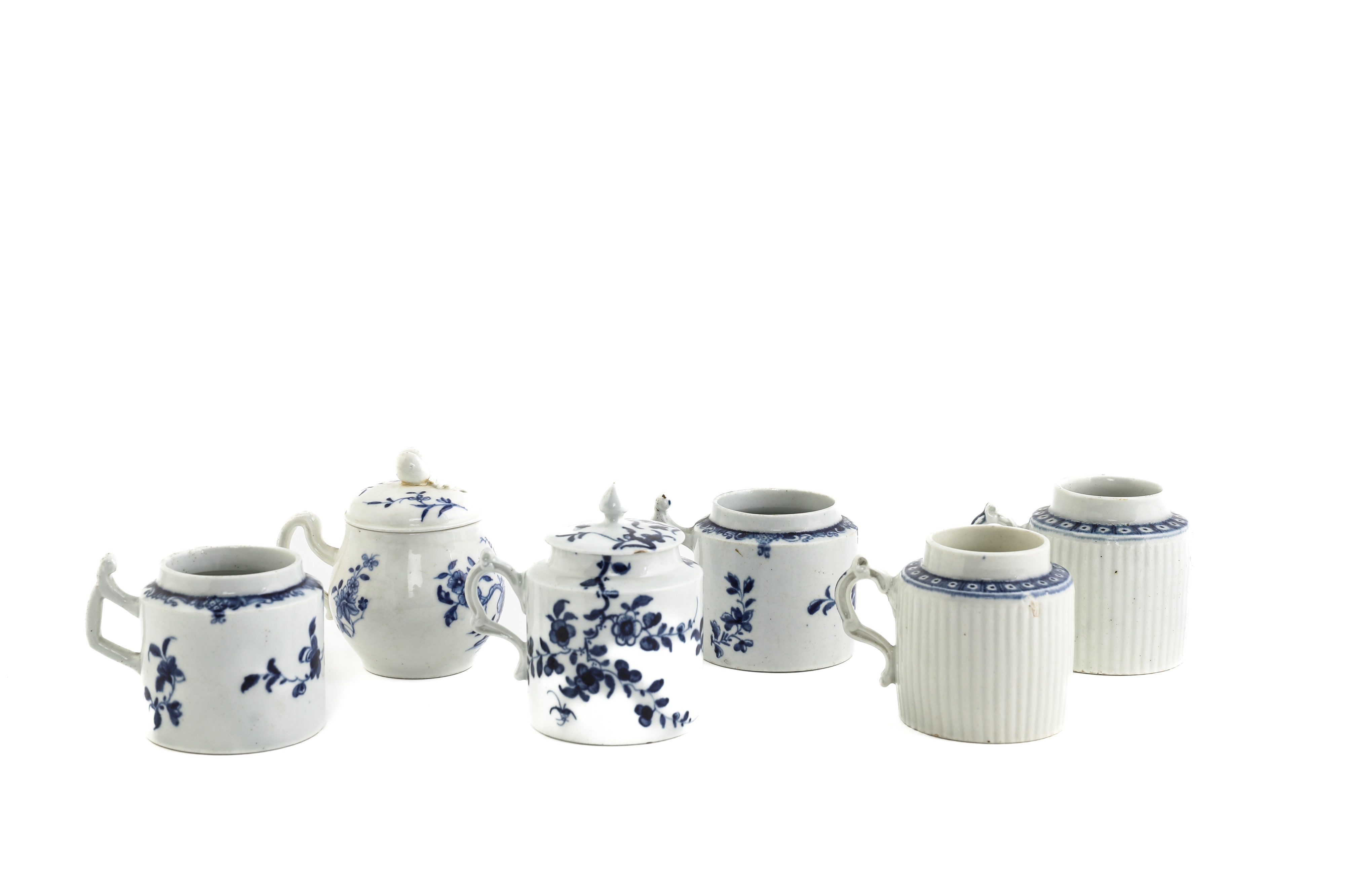 A COLLECTION OF FIVE WORCESTER BLUE AND WHITE MUSTARD POTS