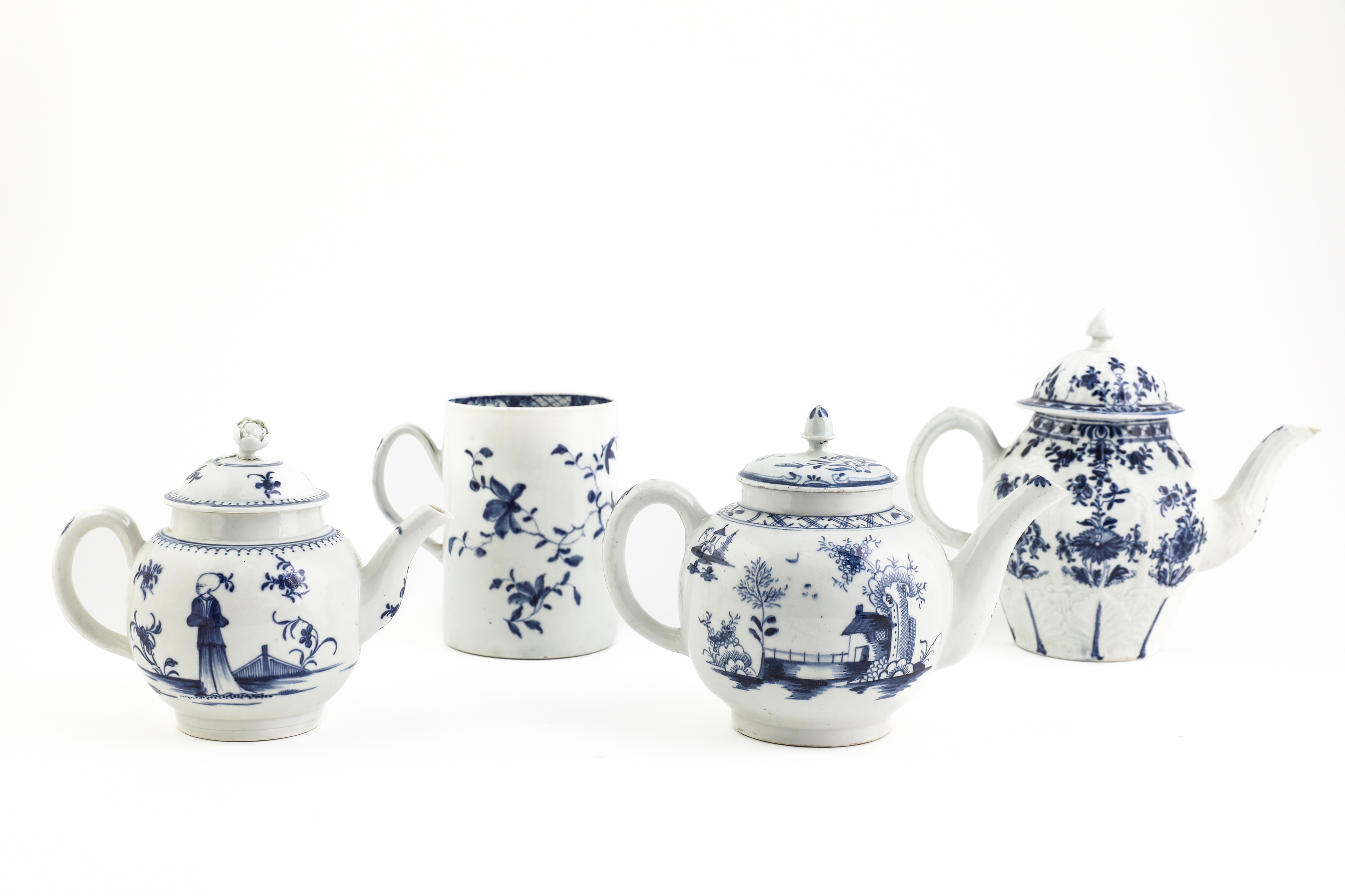 painted in the Waiting Chinaman pattern, together with a Philip Christian (Liverpool) teapot and cover, with floral panels inside moulded arches, a Lowestoft teapot and replacement cover, painted in the Island House pattern and a Worcester mug painted in the Mansfield pattern (7)