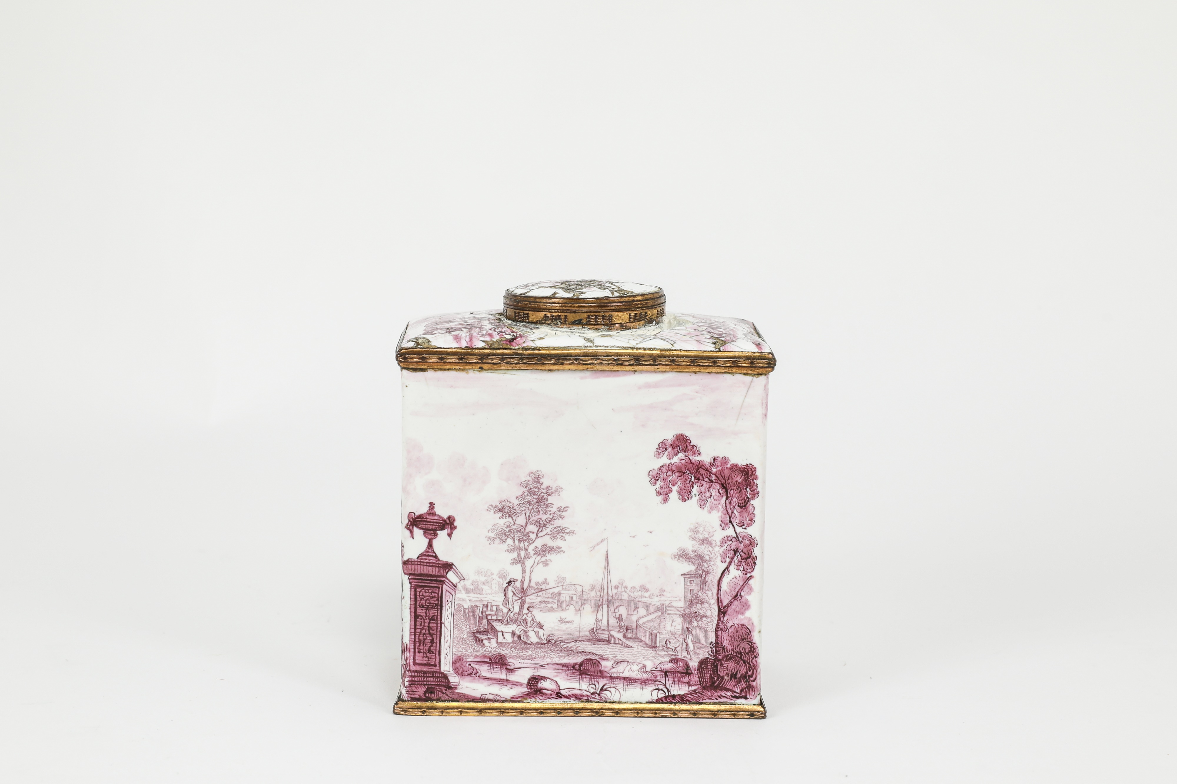 A SOUTH STAFFORDSHIRE ENAMEL TEA CANISTER AND COVER
