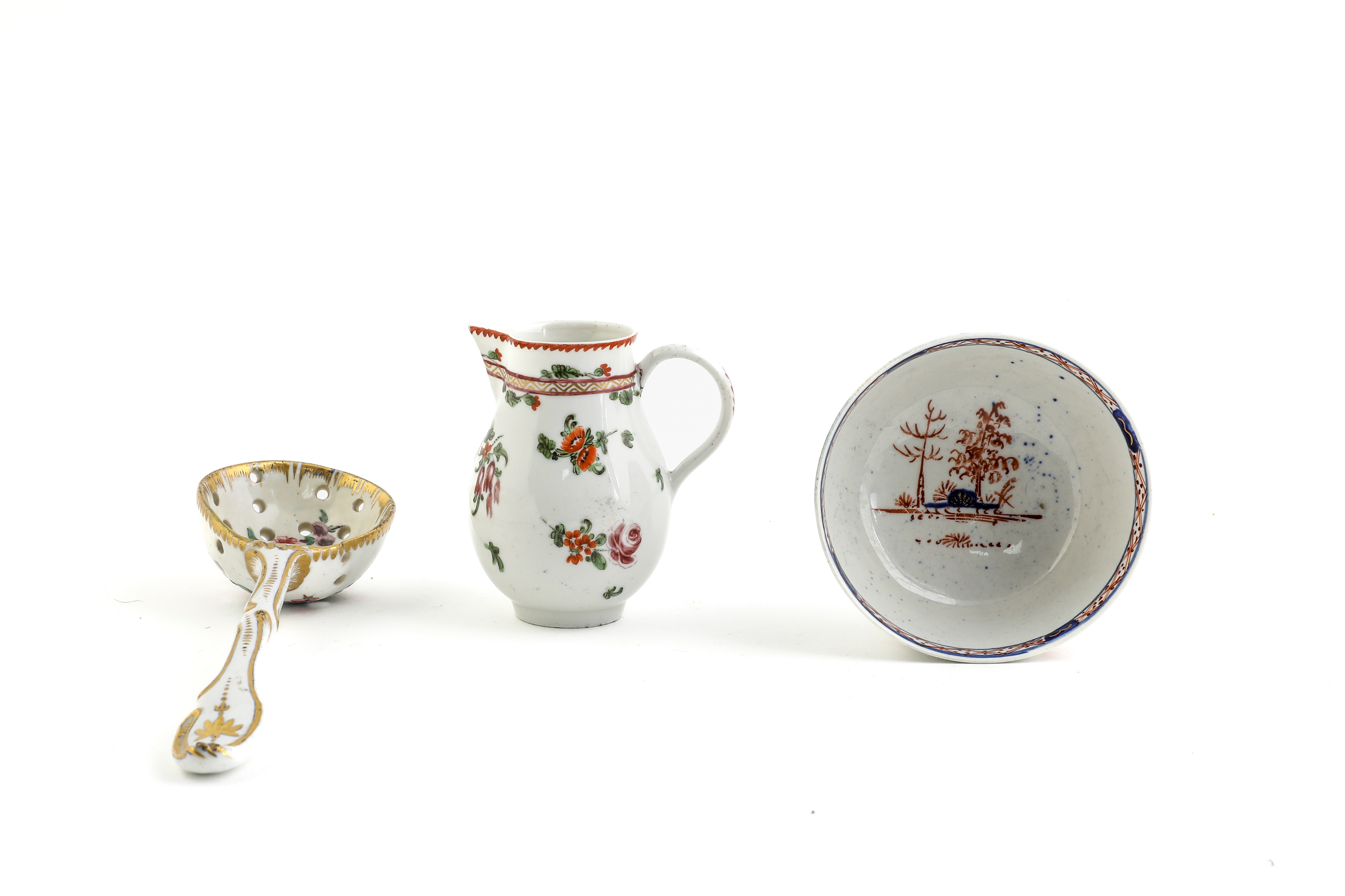 enamelled with flowers inside a feathered gilt rim and with a rococo style handle, together with a Bristol porcelain sparrow beak cream jug enamelled with floral sprigs and a Vauxhall teabowl, painted in the imari palette with a chinoiserie figural scene (3)