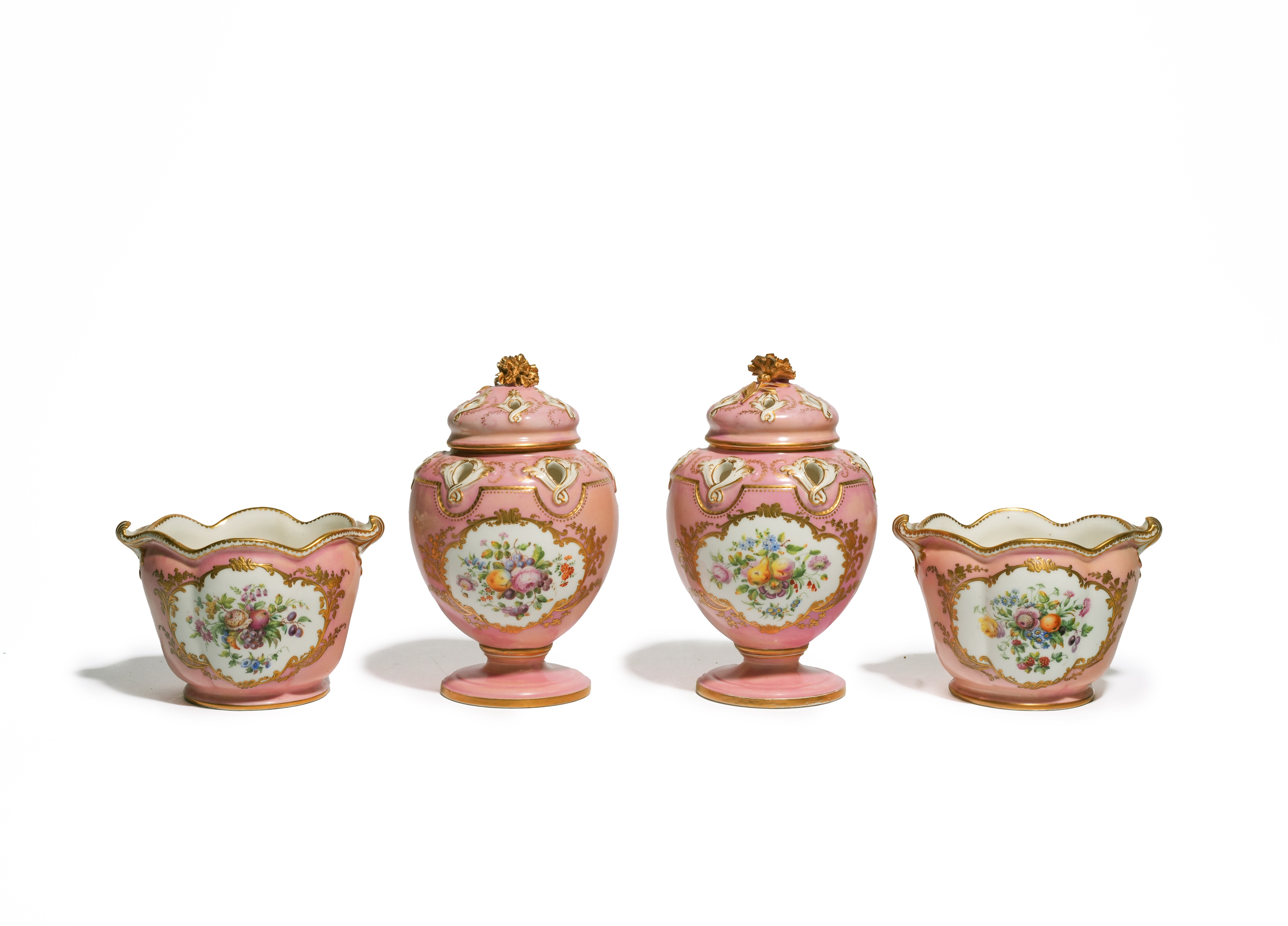 of Sèvres pot pourri Pompadour shape, painted with panels of flowers on a rose pink ground, the shoulders and necks pierced with holes, a pair of Vincennes-style glass coolers after the seau à verre échancré shape, painted with panels of fruit and flowers on a pink ground, together with three Coalbrookdale glass coolers and a jardiniere in the Sèvres manner painted with flowers, blue CBD marks (10)