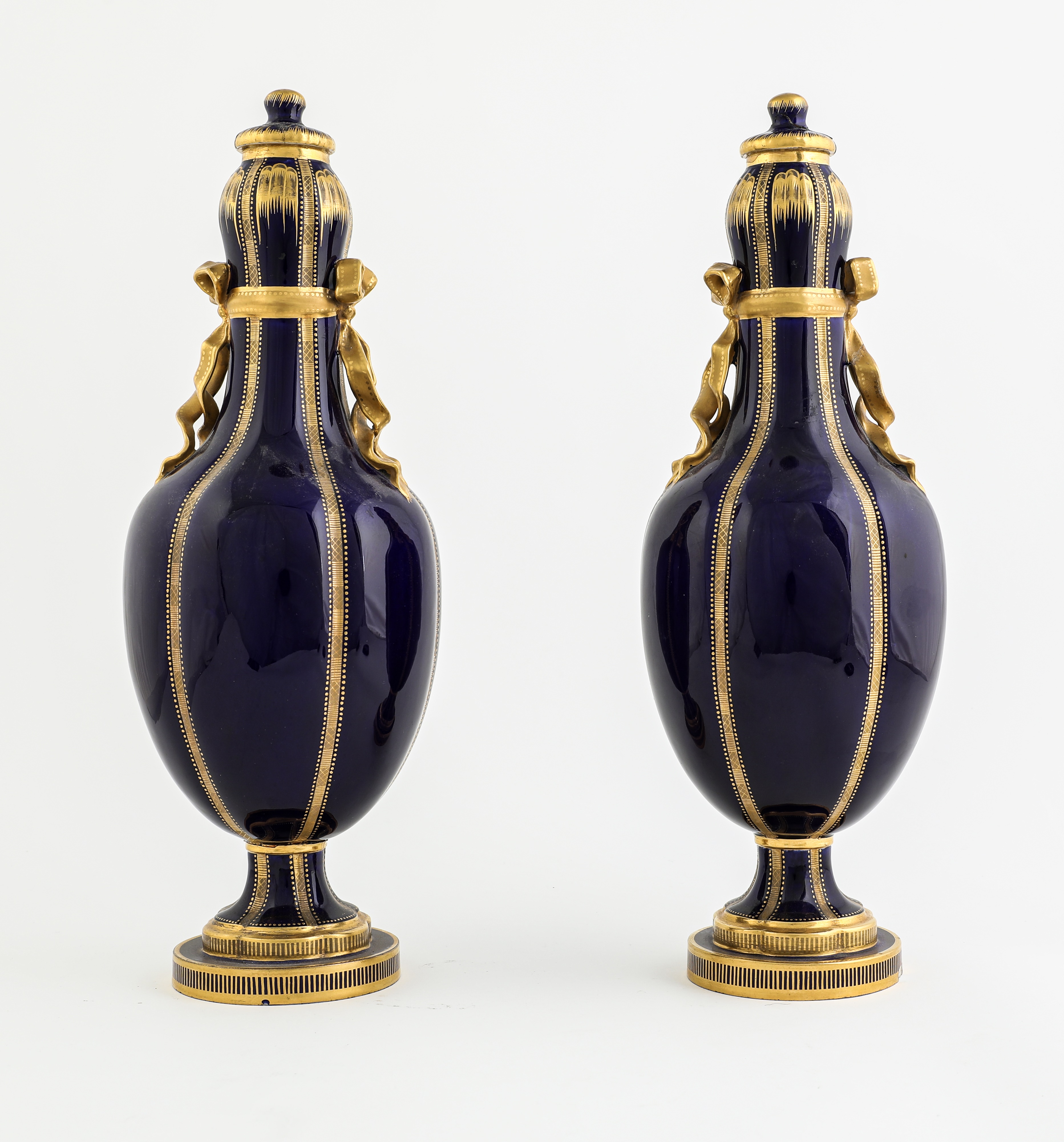 each of footed baluster form, with gilt ribbon and banding on a bleu du roi ground (2)