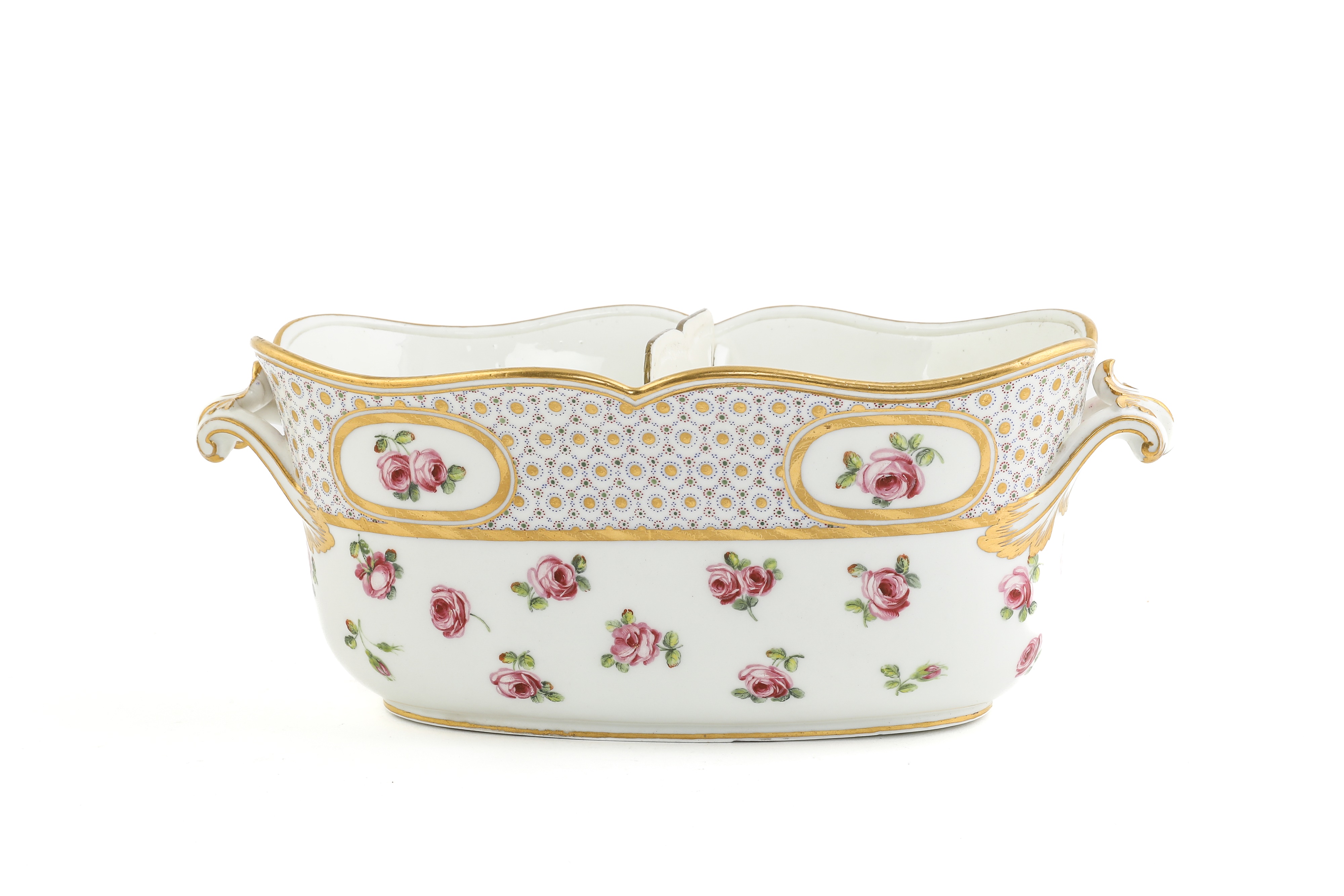 the oval body painted with rose sprigs beneath a border of gold and enamel spots and dots, a removable pierced divider, interlaced Ls enclosing the date letter 'Q' (2)