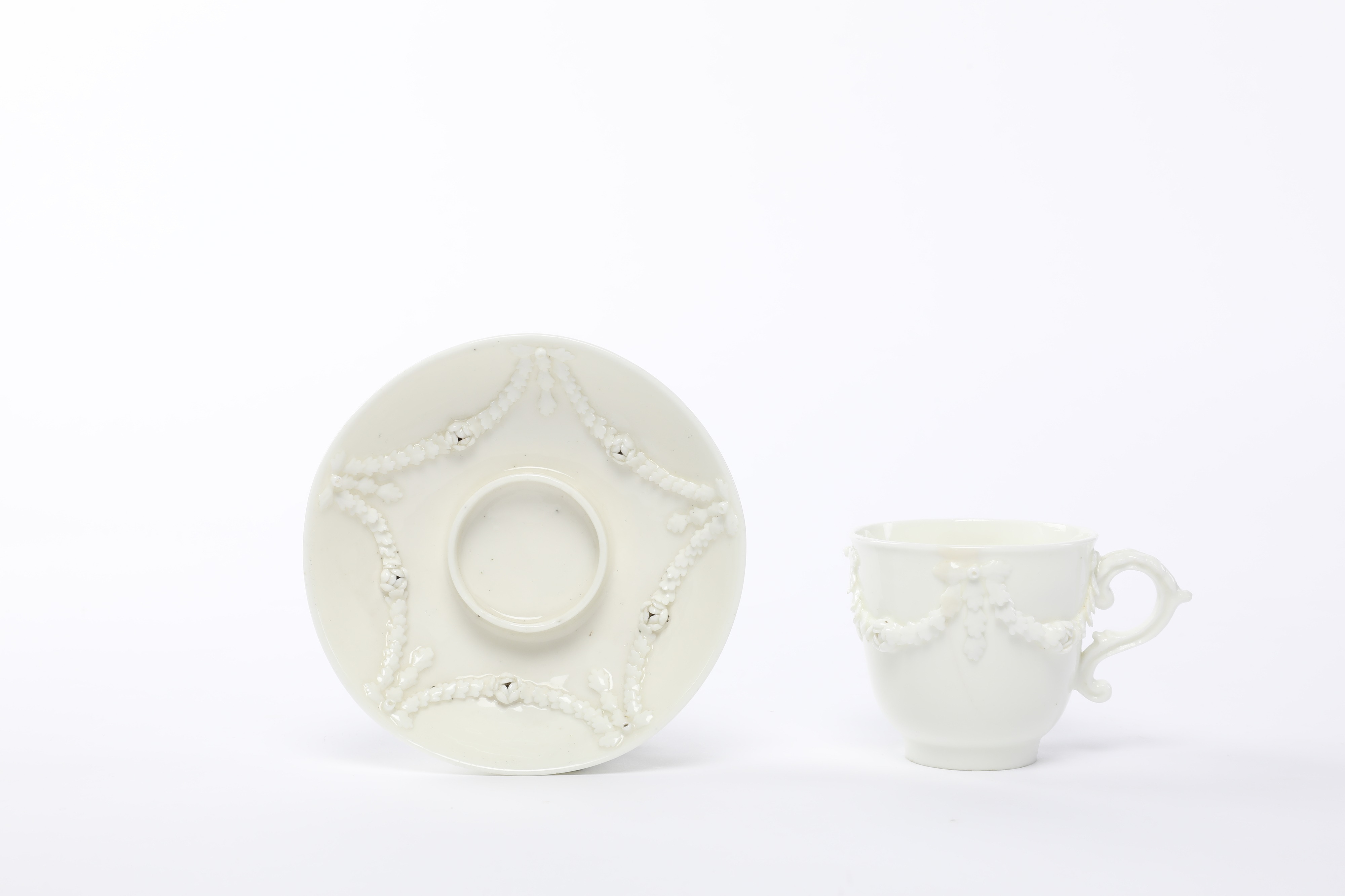 A MENNECY WHITE-GLAZED TREMBLEUSE CUP AND SAUCER