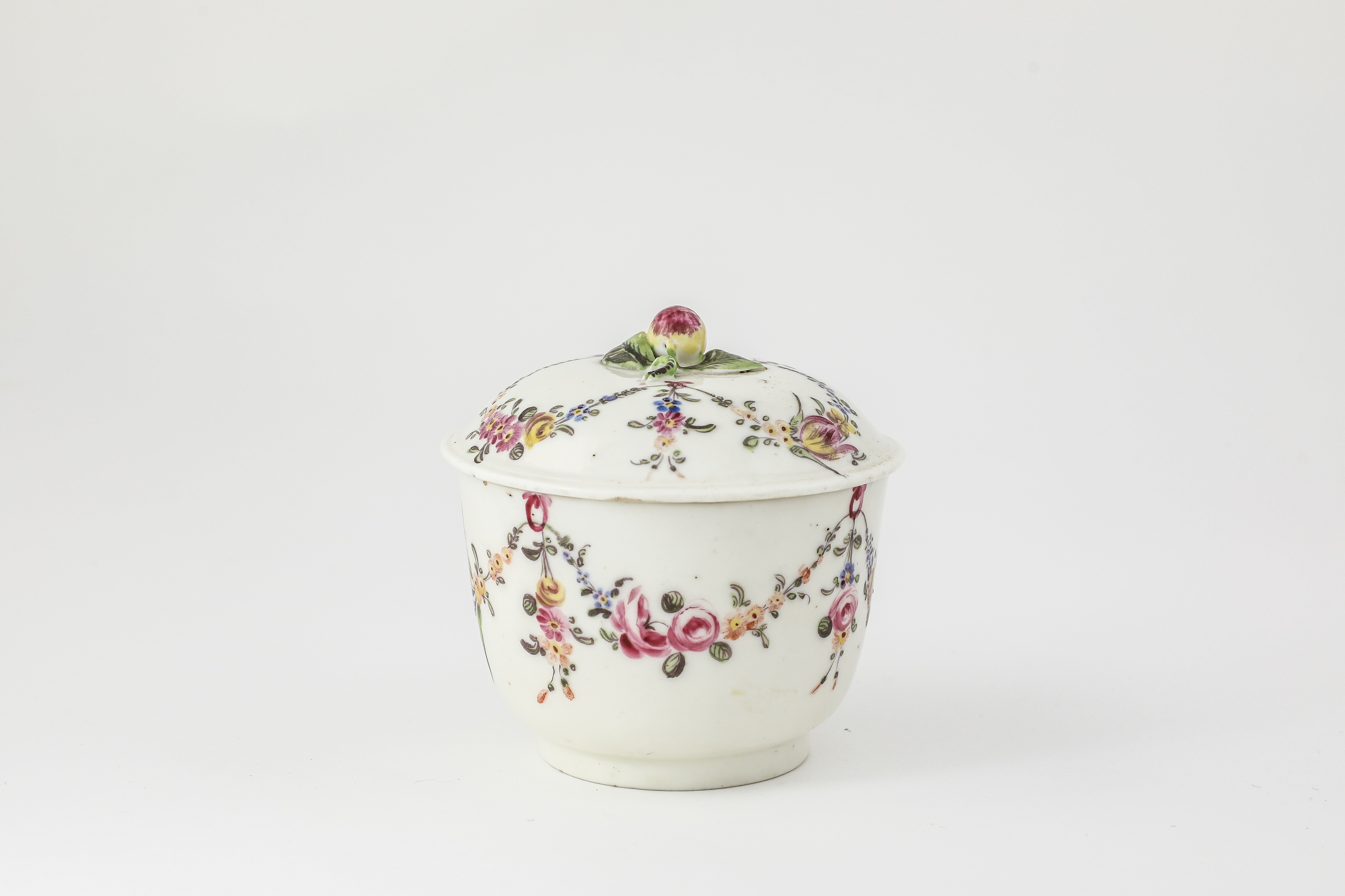 the domed cover with a fruit and leaf knop and delicately painted with colourful flower swags, incised 'DV' mark (2)