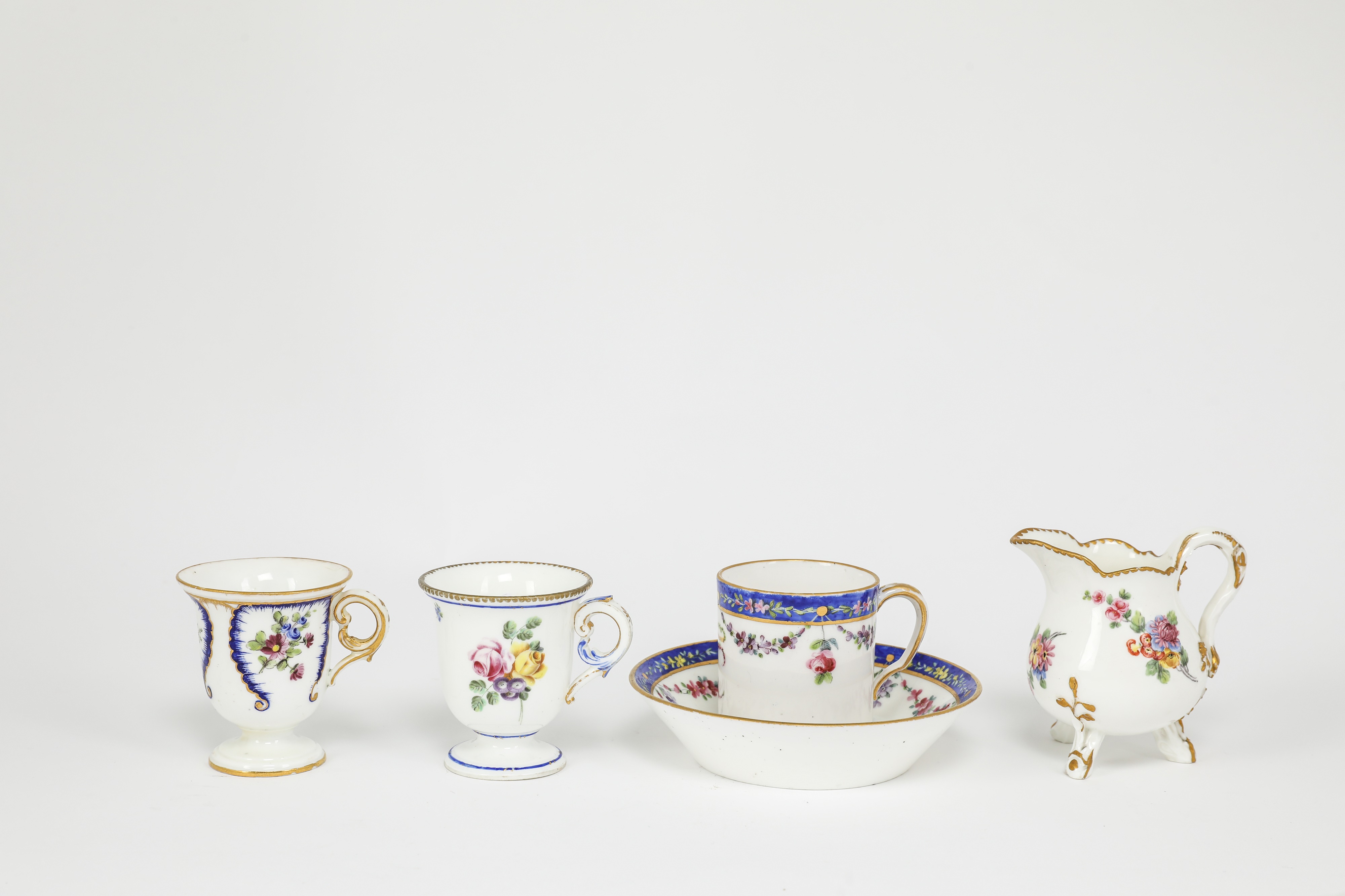 painted with small sprays of roses and other flowers, interlaced blue Ls mark and date letter B, a Sèvres style ice cup, c.1760-70, painted with floral sprays within feuilles de choux borders, a Vincennes or Sèvres footed jug (pot à lait à trois pieds), date code for 1770, painted with floral sprays on a white ground, black interlaced Ls marks, and a Sevres style coffee can and saucer (gobelet litron et soucoupe), late 18th century, with a floral initial 'C' and swags (5)