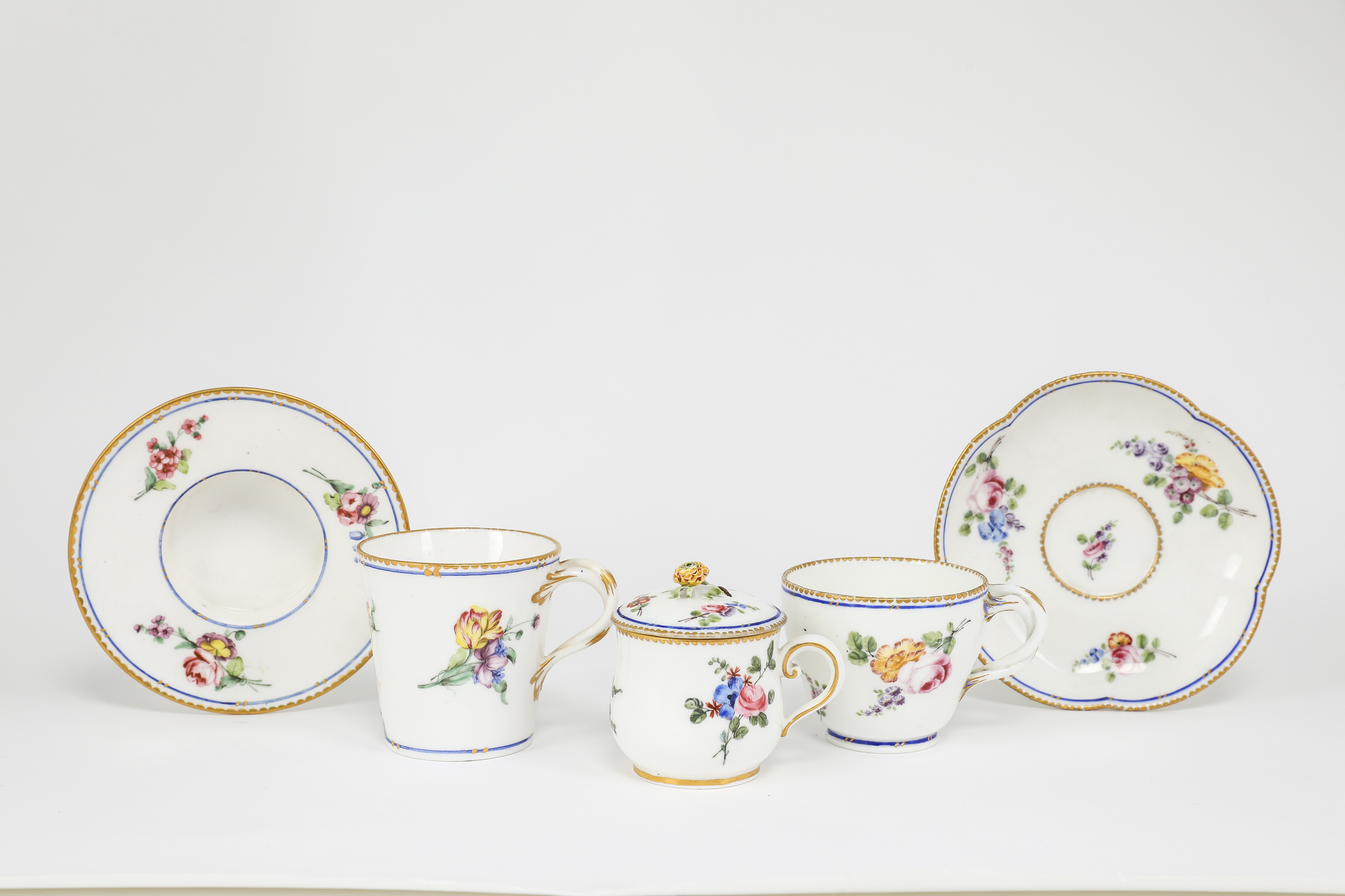 painted with floral sprigs inside blue lines and gilt scalloped rims, comprising: a cup and trembleuse saucer (goblet a la Reine et soucoupe), a cup and saucer (goblet Herbert et soucoupe) and a custard cup and cover (pot a jus), each with blue interlaced Ls marks (5)
