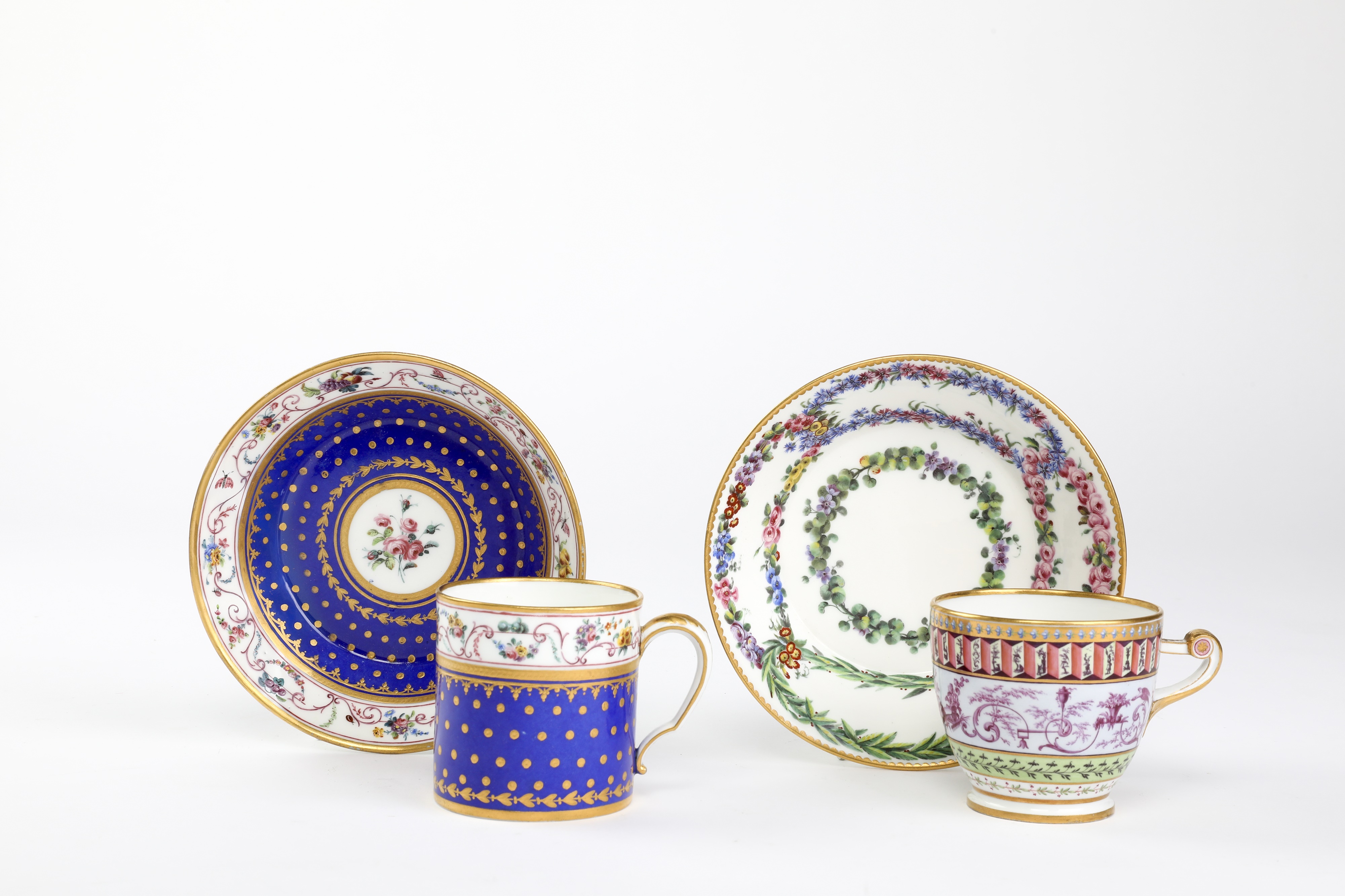 painted with border of scrolling classical foliage and motifs above a bleu nouveau and gilt dot body, blue interlaced Ls mark, painter mark P, a Sèvres saucer, date code for 1767, painted with interlinked floral wreaths, painter's mark of three dots, and a French Empire style cup, c.1800, with a puce painted scrolling band between geometric and floral bands (4)