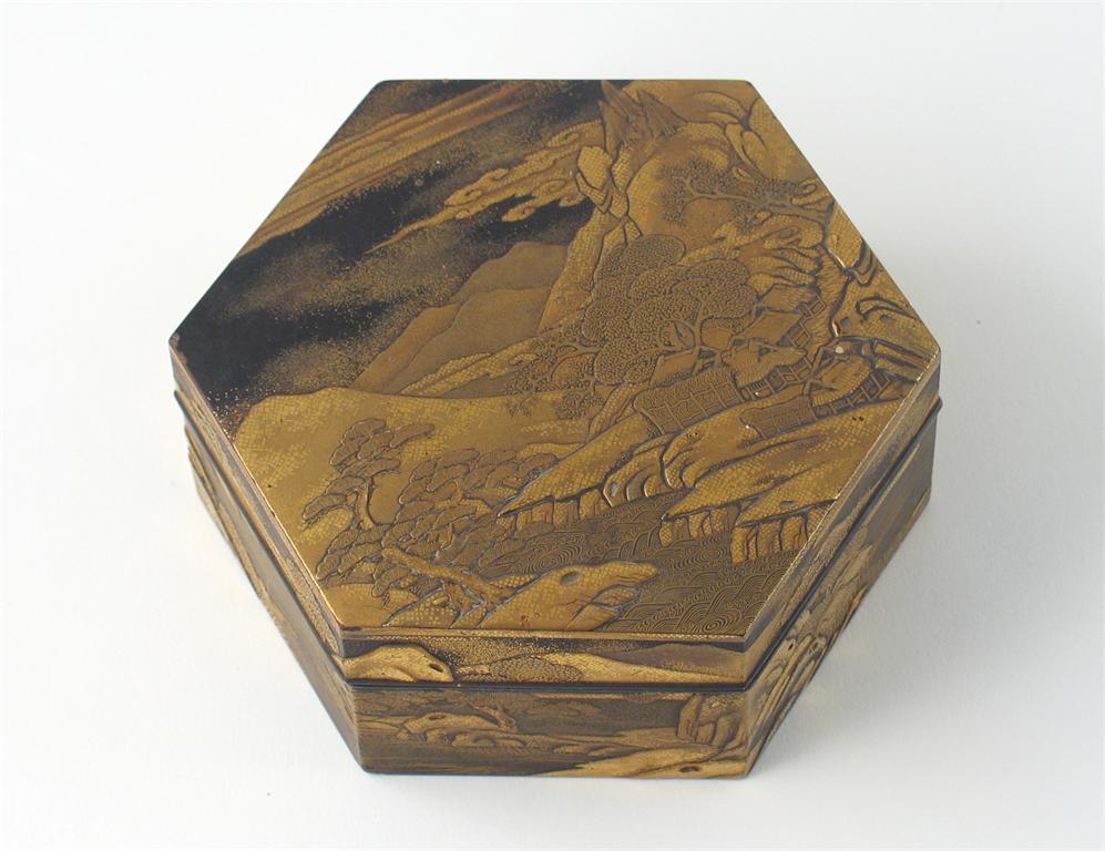 A Japanese gold lacquer hexagonal box and cover