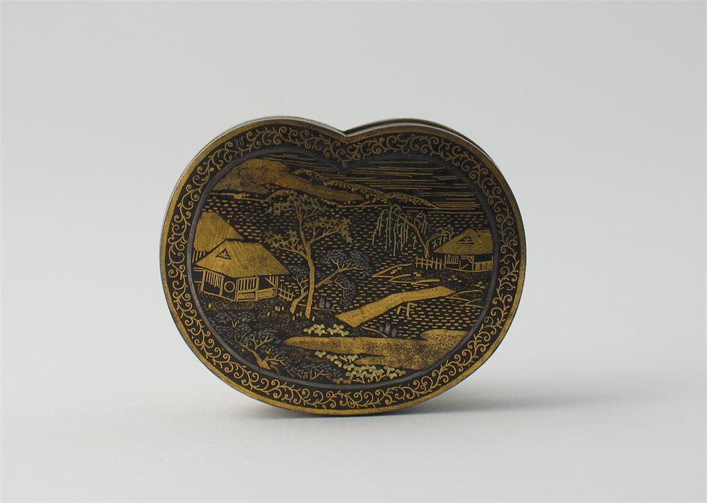 A Japanese Komai kidney-shaped box and cover, decorated in gold and silver with pavilions in a landscape, 19th century, 6cm. (2)