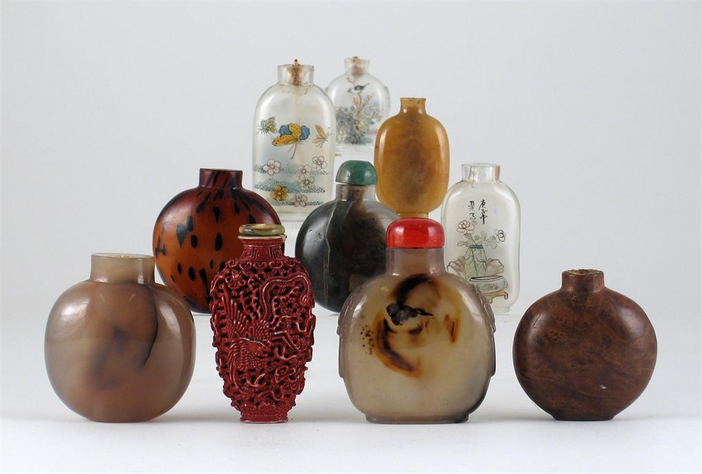 A Chinese porcelain coral red snuff bottle, moulded with a dragon and phoenix, four character Jiaqing mark, but later, and 12 other snuff bottles, 8cm. max. (13)