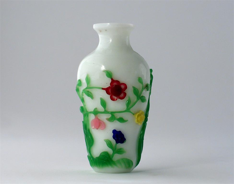 A Chinese six colour Beijing glass vase, decorated with a phoenix standing on rockwork from which issue flowers and leaves, 18th/19th century, 12cm.
