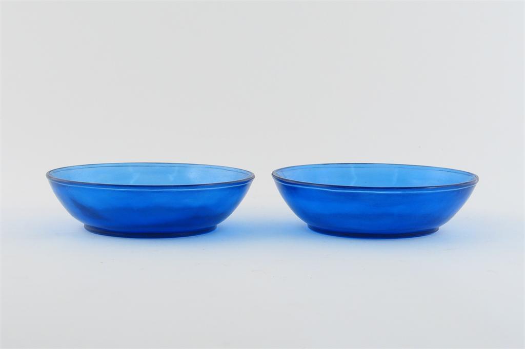 A pair of Chinese blue Beijing glass shallow bowls, each incised on the base with a four character Jiaqing mark 1796-1820 and probably of the period, 16.5cm. (2)