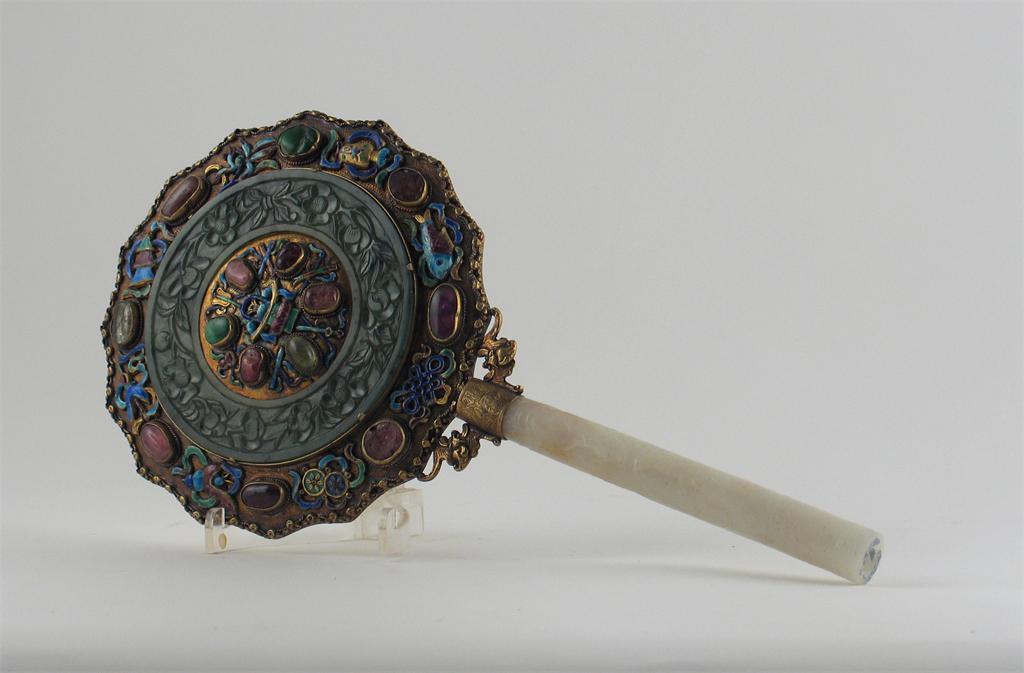 A Chinese hand mirror, with a white jade handle, the back set with a spinach jade bi, with semi-precious stones and enamelled emblems on a gilt metal ground, together with a Charlotte Horstmann invoice from the 1950s, 30cm.
