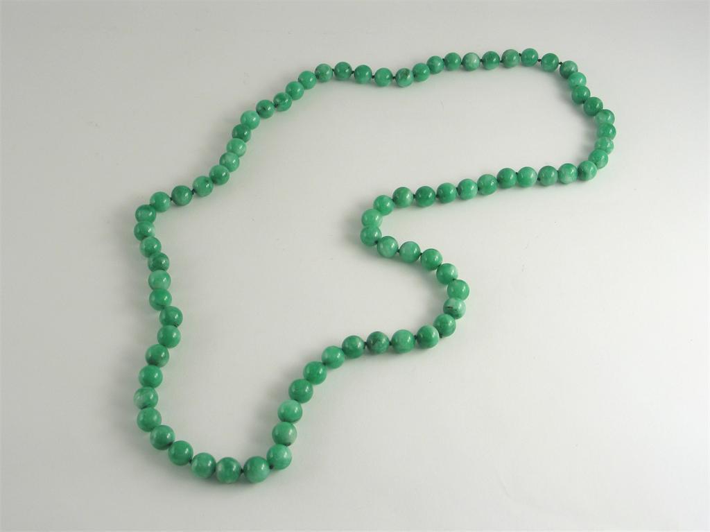 A Chinese jade necklace, comprising eighty beads of apple green stone, 61cm. This has not been tested for colour enhancement.