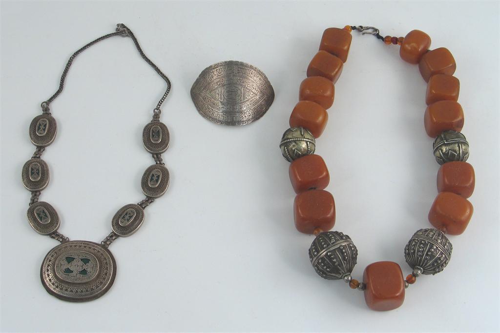 Two Middle Eastern necklaces, one amber and silver-coloured metal, the other decorated with green glass, and an armband with Arabic calligraphy. (3)