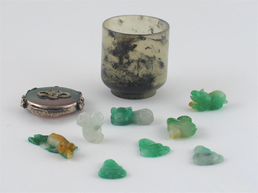 A silver-coloured metal mounted circular jade pendant, the stone colour varying from apple green through to red-brown, a nephrite jade small beaker, and eight small jadeite pieces, 19th and 20th centuries. 5.5cm. max. (10) These have not been tested for colour enhancement.
