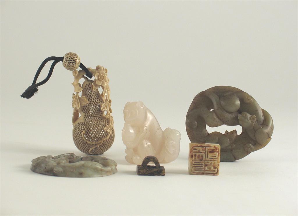 Two Chinese hardstone bi discs, each carved with mythical beasts, a gilt metal seal, a hardstone seal, a white jade carving of two monkeys and an ivory reticulated box formed as a gourd. Some damages. 6cm. max. (6)