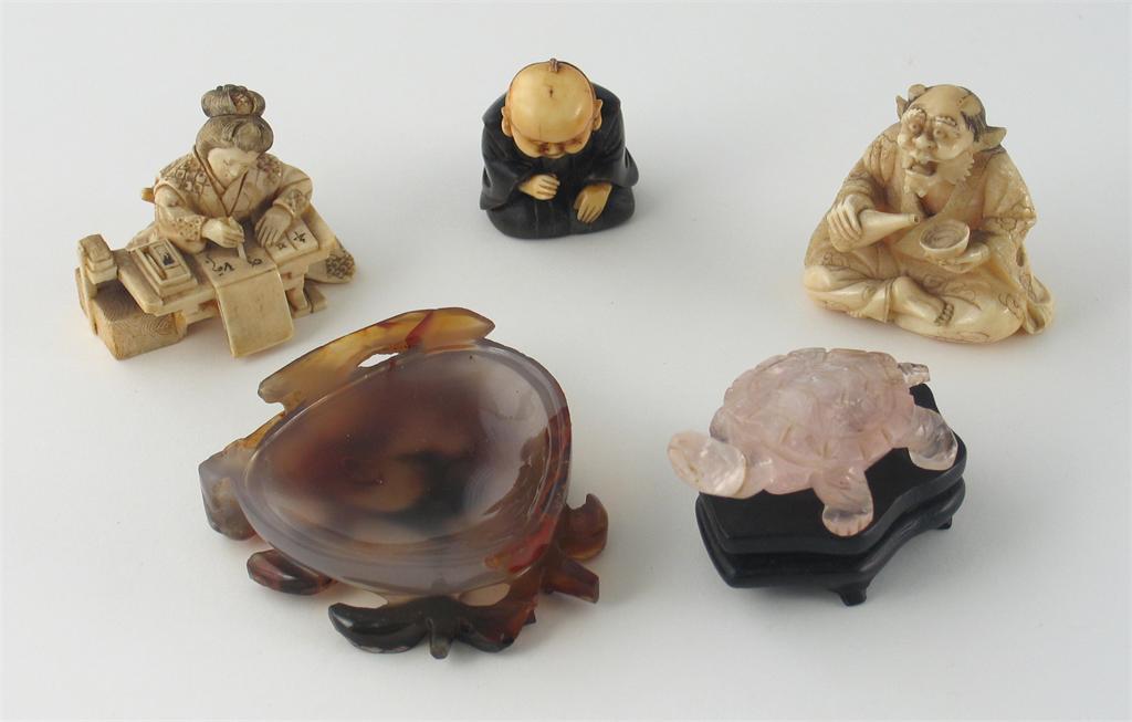 Three Japanese okimono, in ivory and horn, an agate peach-shaped brush washer and a rose quartz turtle, 19th/20th century, 7.5cm. max. One with a stand. (6)