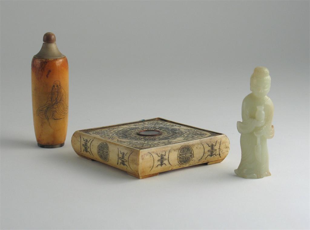 A small pale celadon jade carving of a standing lady, a bone snuff bottle engraved with two figures and a bone compass, 12.5cm. max. (3)