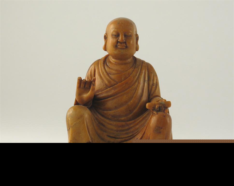 A Chinese yellow soapstone carving of a seated figure, wearing robes and holding a tablet. One foot restored. 19th century, 12.5cm.