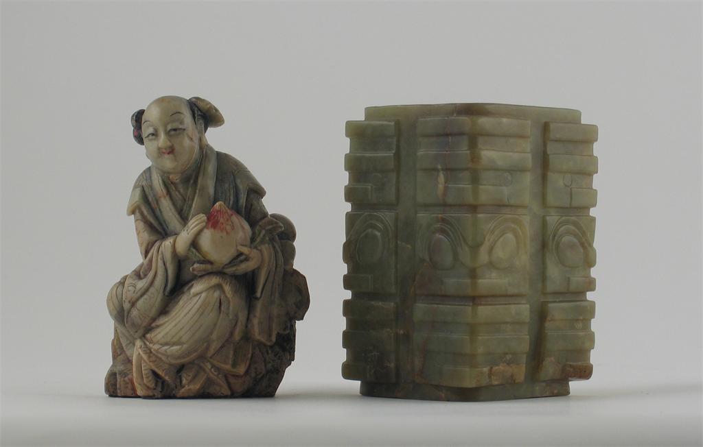 A Chinese soapstone carving of a seated figure holding a peach, c.1800, and a Chinese celadon jade archaic-style cong. Some wear. 10.5cm. (2)