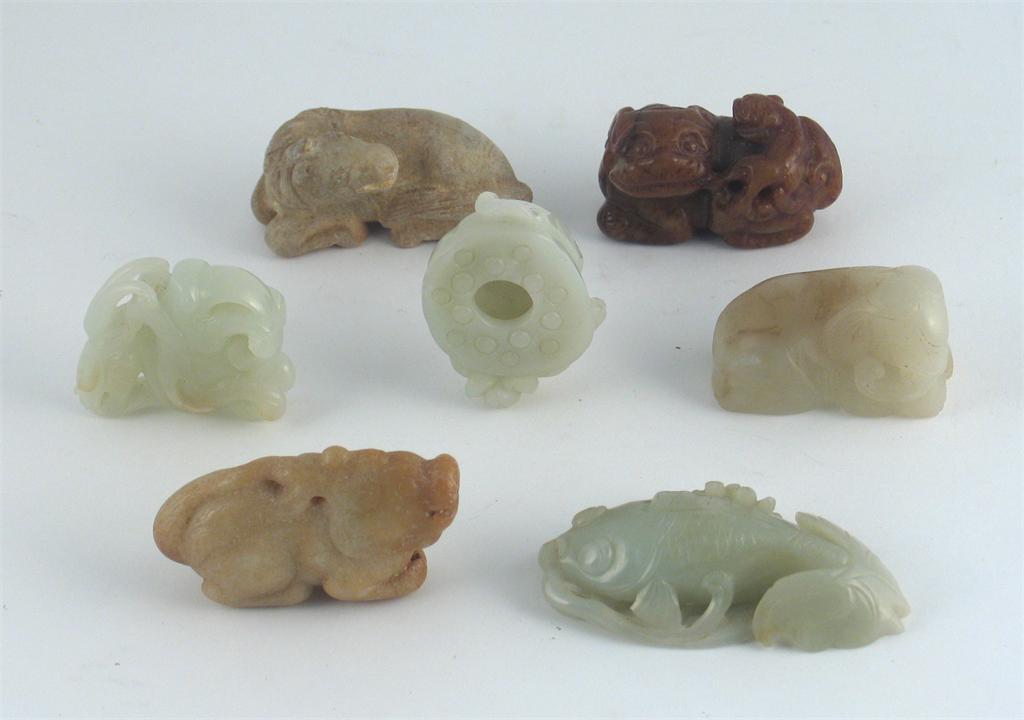 A Chinese jade carving of a lotus seed pod, another of a goldfish with an elaborate tail, and five further hardstone carvings, 19th/20th century, 7.5cm. max. (7)