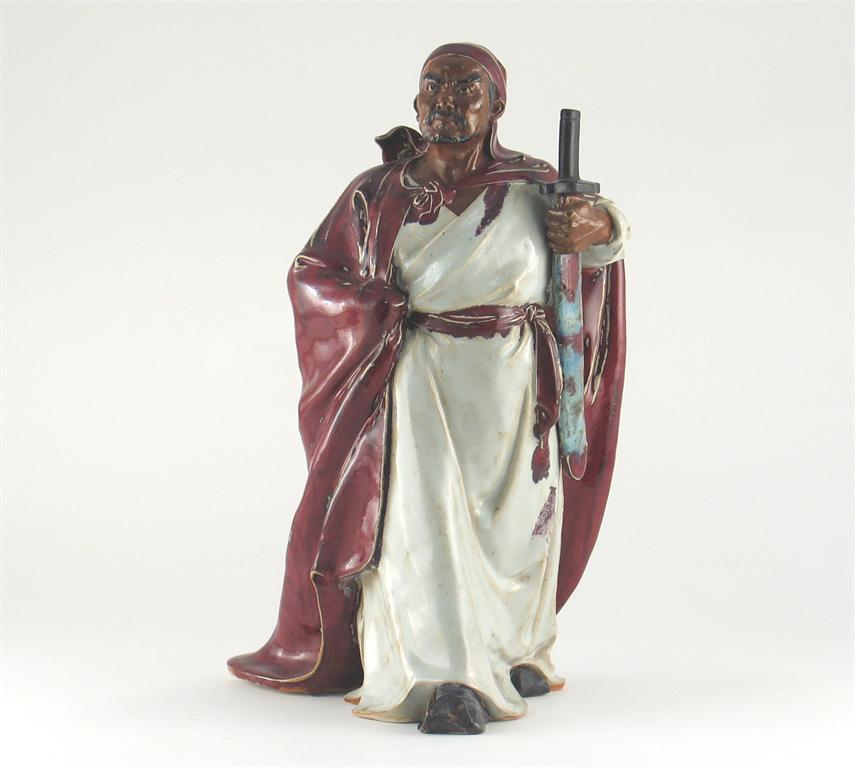 A flamb? glazed stoneware model of a warrior, wearing a long red cloak, c.1900, 38cm.