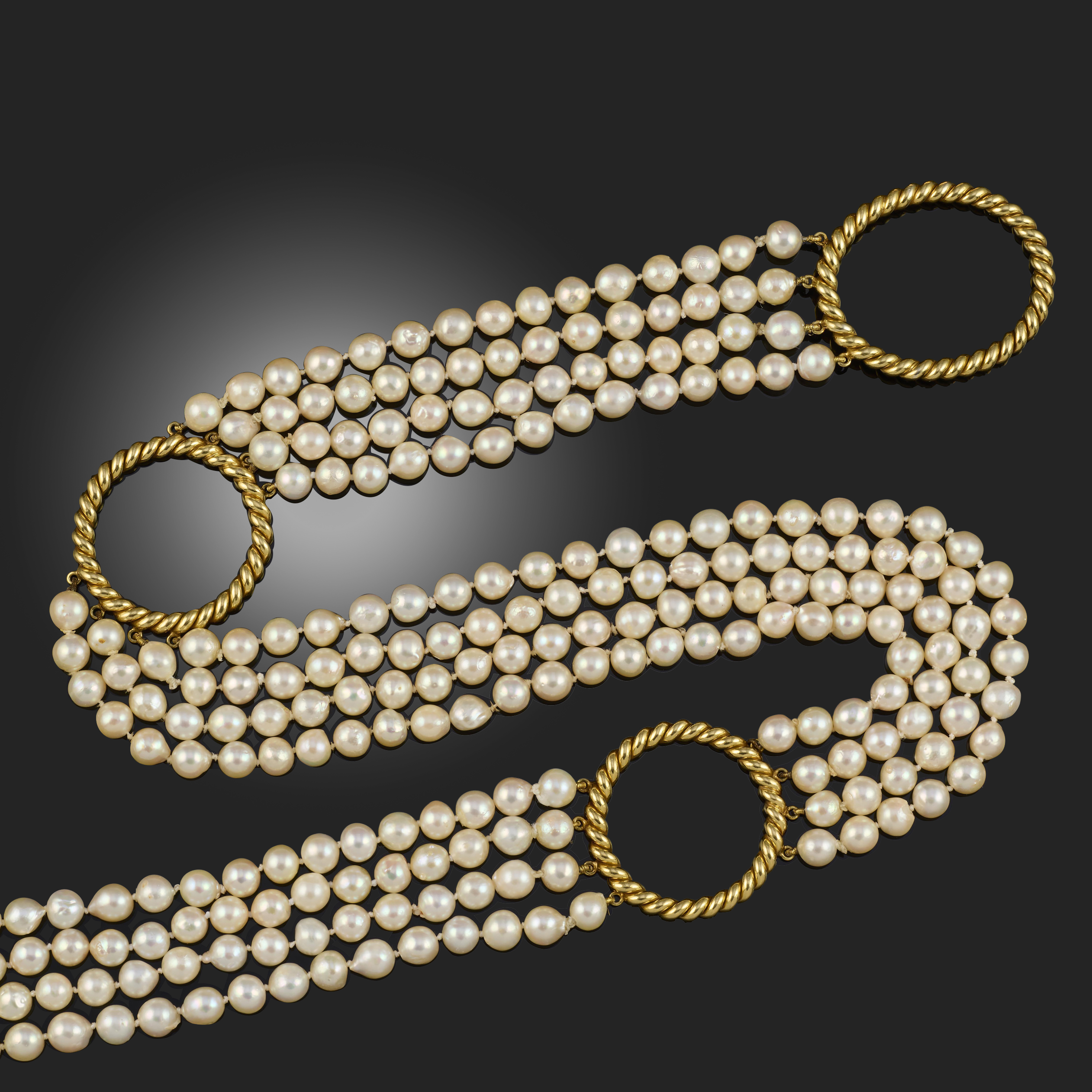 A CULTURED PEARL AND GOLD NECKLACE, composed of four rows of cultured pearls interspersed with three circular yellow gold rope-twist links, to an oval clasp with a yellow gold rope-twist border, stamped 750, length 85cm