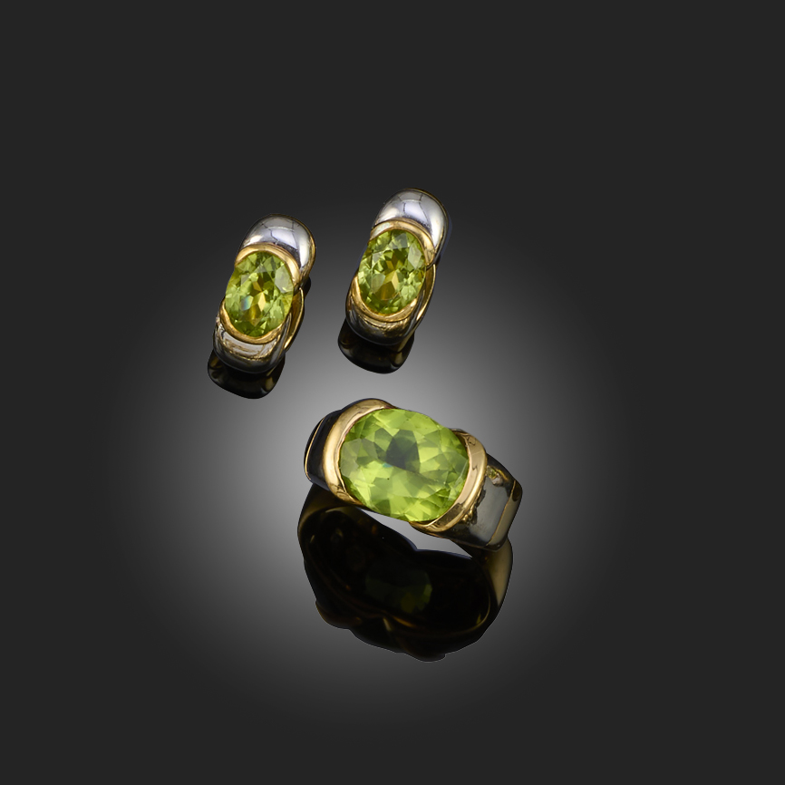 MARINA B, A PERIDOT RING, C1998, WITH SIMILAR EARRINGS, comprising a bi-colour gold ring set with an oval peridot, maker's mark, numbered C1647, London import marks for 1998, size Q, with a similar pair of peridot earrings by Boodle & Dunthorne, C2003, set with oval peridots in bi-colour gold, London hallmarks for 18ct gold, 2003, post and clip fittings, length 1.6cm