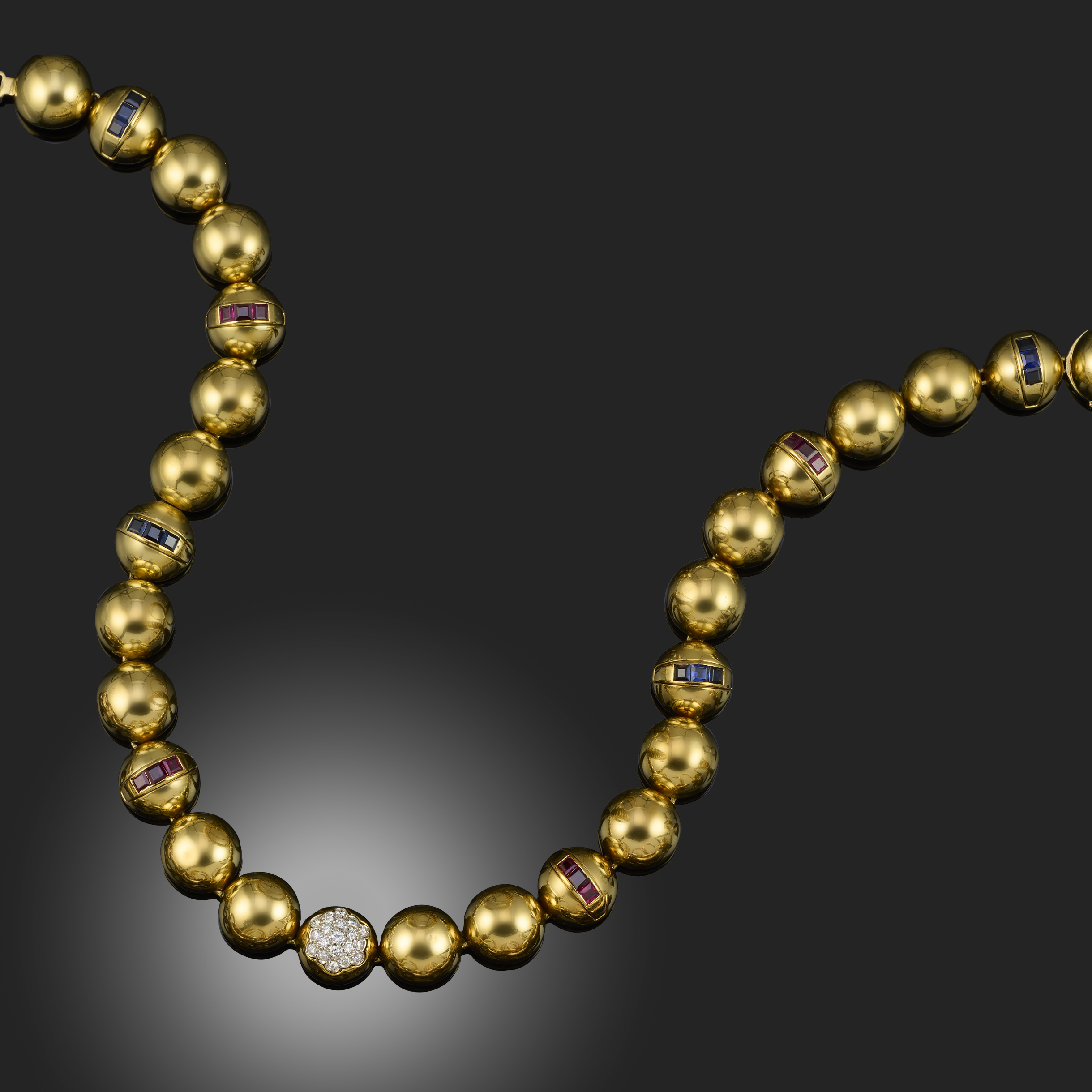 A RUBY, SAPPHIRE, DIAMOND AND GOLD NECKLACE