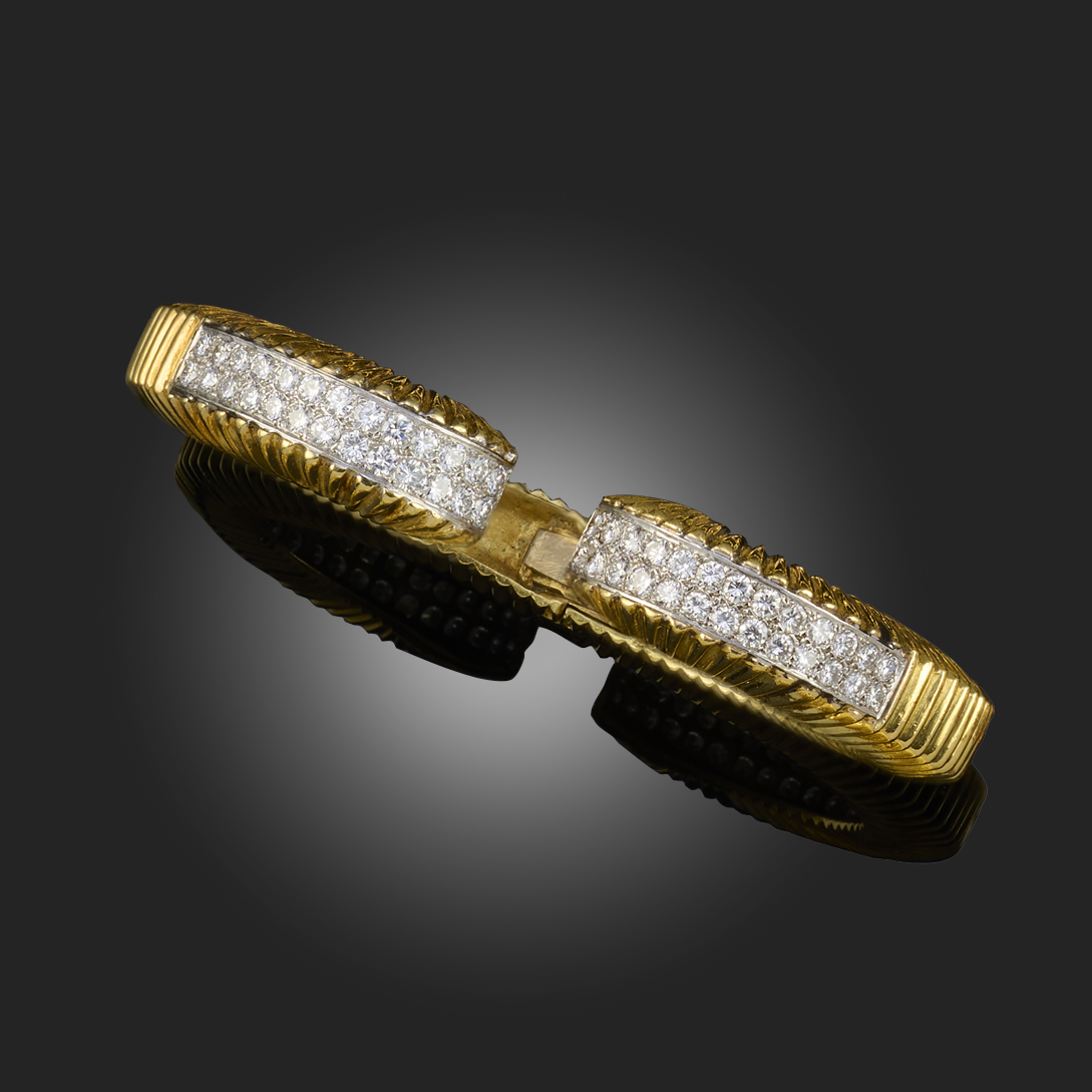 A DIAMOND-SET AND GOLD HINGED TORQUE BANGLE, of fluted design, each side terminating in a panel pavé-set with round brilliant-cut diamonds, inner diameter approximately 5.7cm, gross weight 62.5g