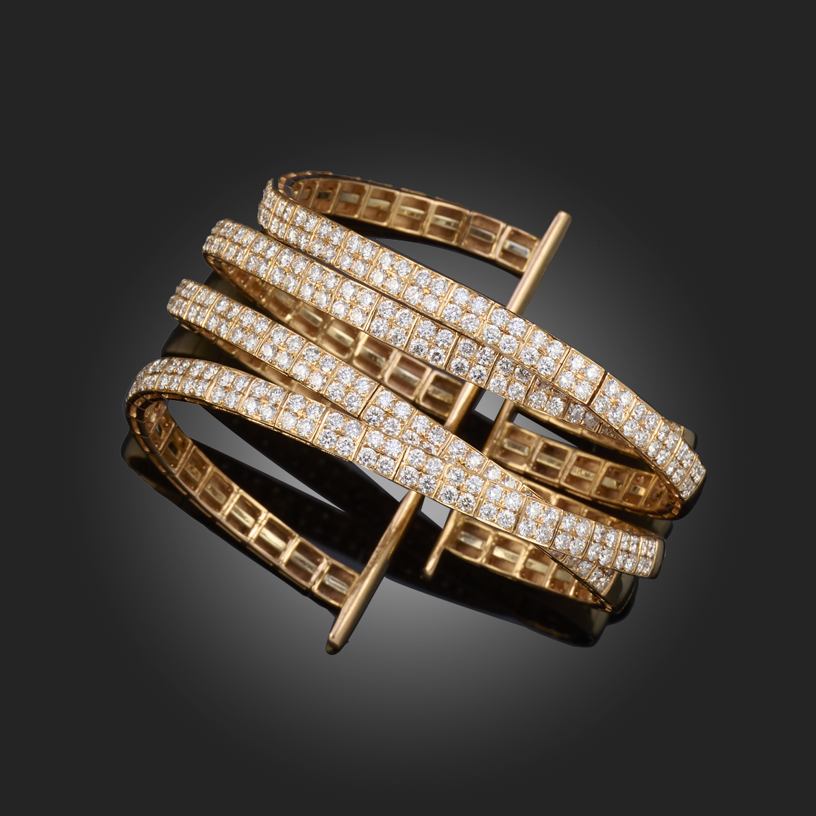 A DIAMOND-SET GOLD BANGLE, the four conjoined bangles with square links, set with clusters of circular-cut diamonds to the upper half in rose gold, inner circumference approximately 15.5cm, gross weight 72g