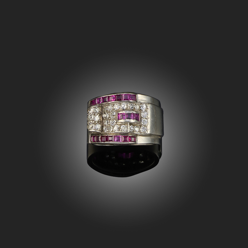AN ART DECO RUBY AND DIAMOND BUCKLE RING
