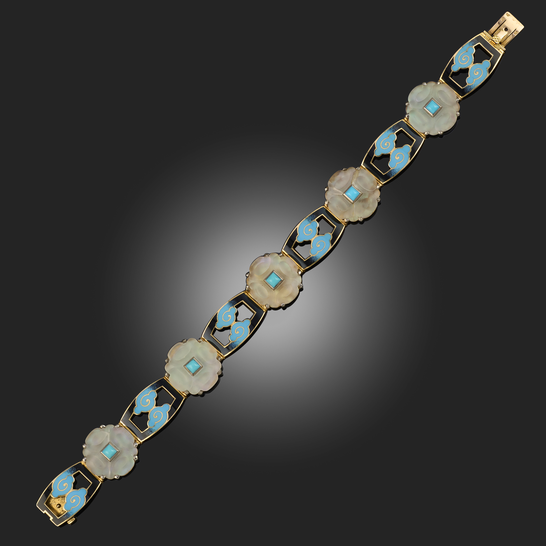 A ROCK CRYSTAL AND ENAMEL BRACELET ATTRIBUTED TO MARZO, set with lozenge-shaped enamel plaques with cloud-like swirls in blue and black shaded enamel, within carved rock crystal plaques above mother of pearl and a central turquoise cabochon, French control marks, unsigned, length 18cm