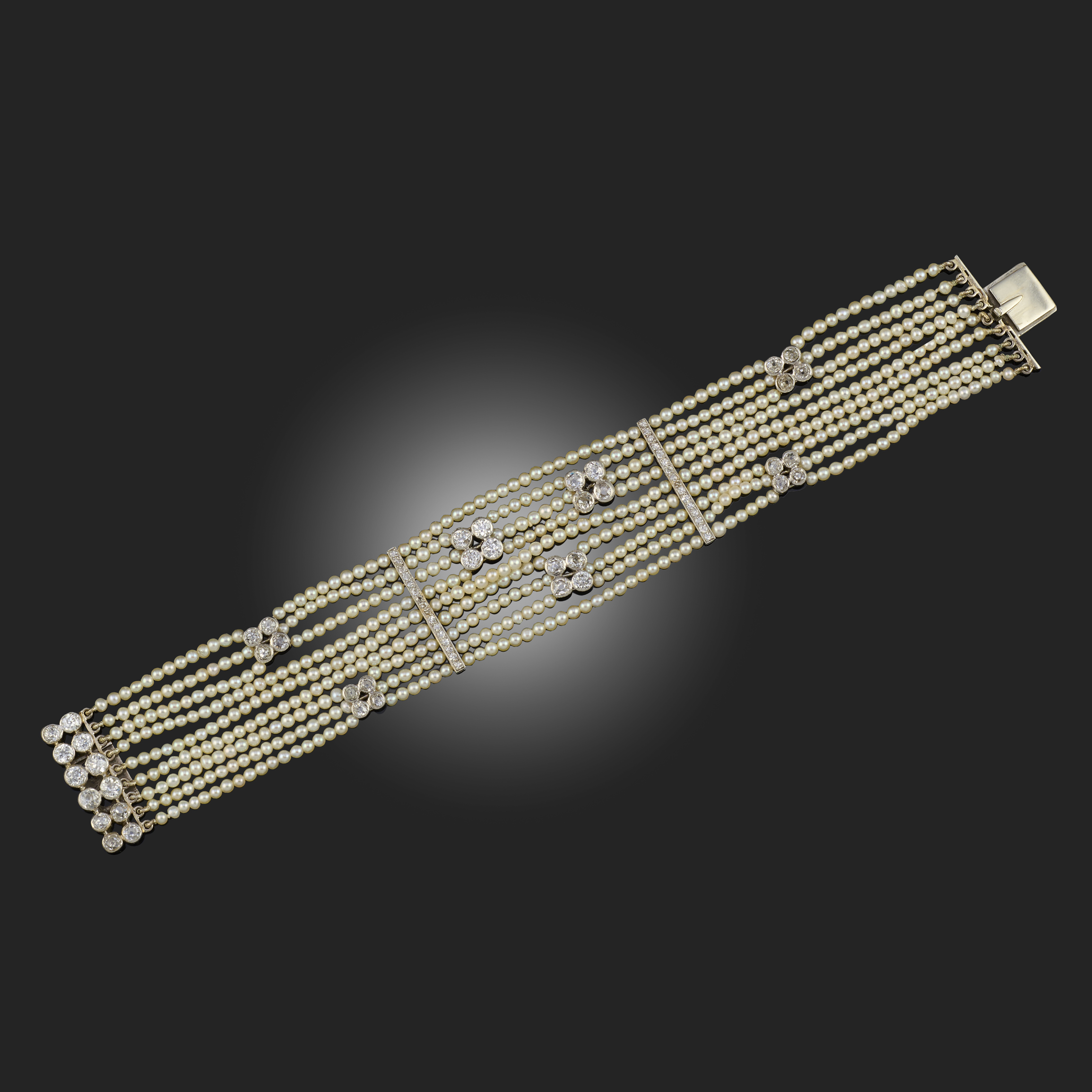 A SEED PEARL AND DIAMOND BRACELET, composed of nine rows of seed pearls set with seven graduated square-shaped motifs set with circular-cut diamonds between three-diamond set bar links, centring on a diamond-set clasp, in white gold, length 18cm