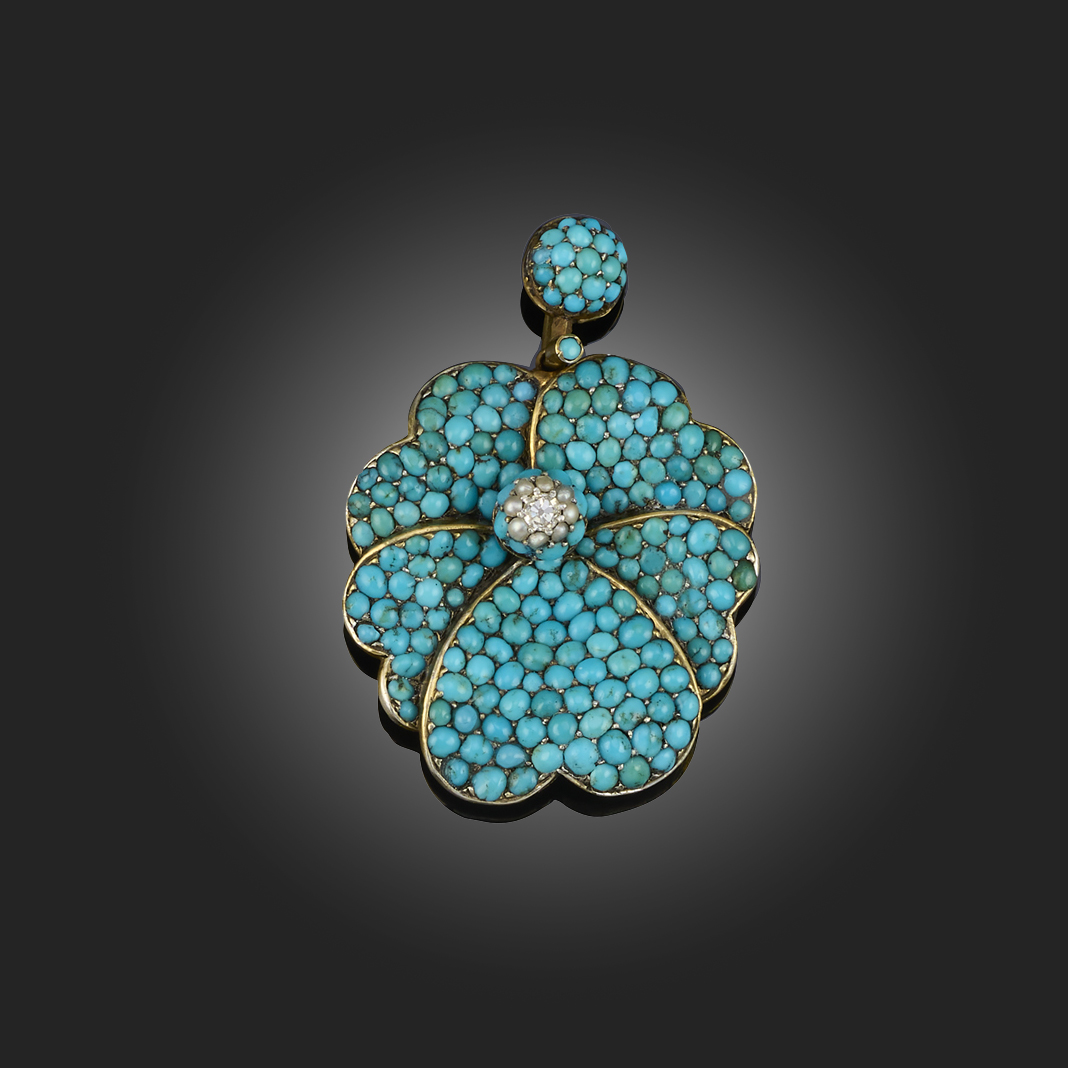A TURQUOISE AND DIAMOND-SET PANSY PENDANT, 19TH CENTURY AND LATER