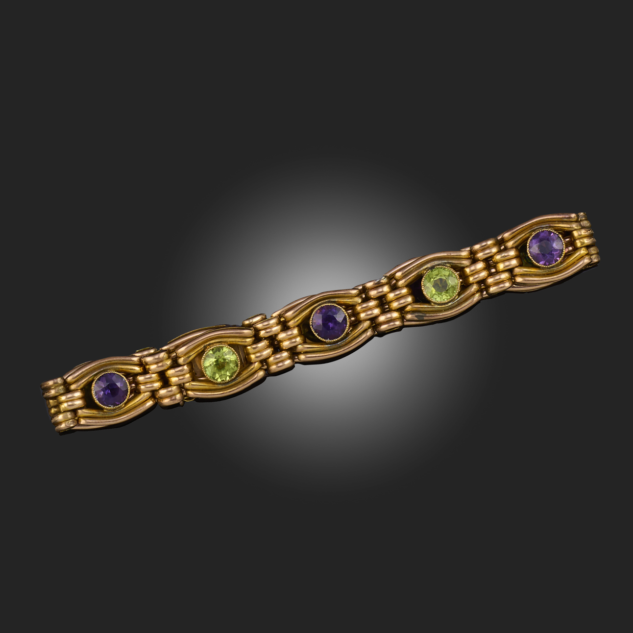 AN AMETHYST AND PERIDOT BRACELET, stamped 15, 22g