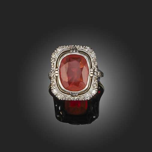 A FIRE OPAL AND DIAMOND CLUSTER RING
