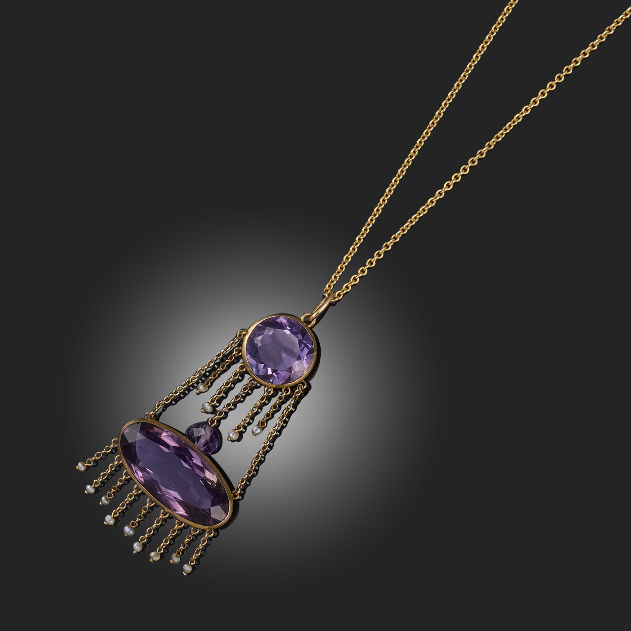 AN EDWARDIAN AMETHYST AND SEED PEARL PENDANT, set with a circular-cut amethyst suspending gold tassels with seed pearl terminals, with a lower oval amethyst and further seed pearl tassels in yellow gold, pendant length 6.2cm, chain length 43cm