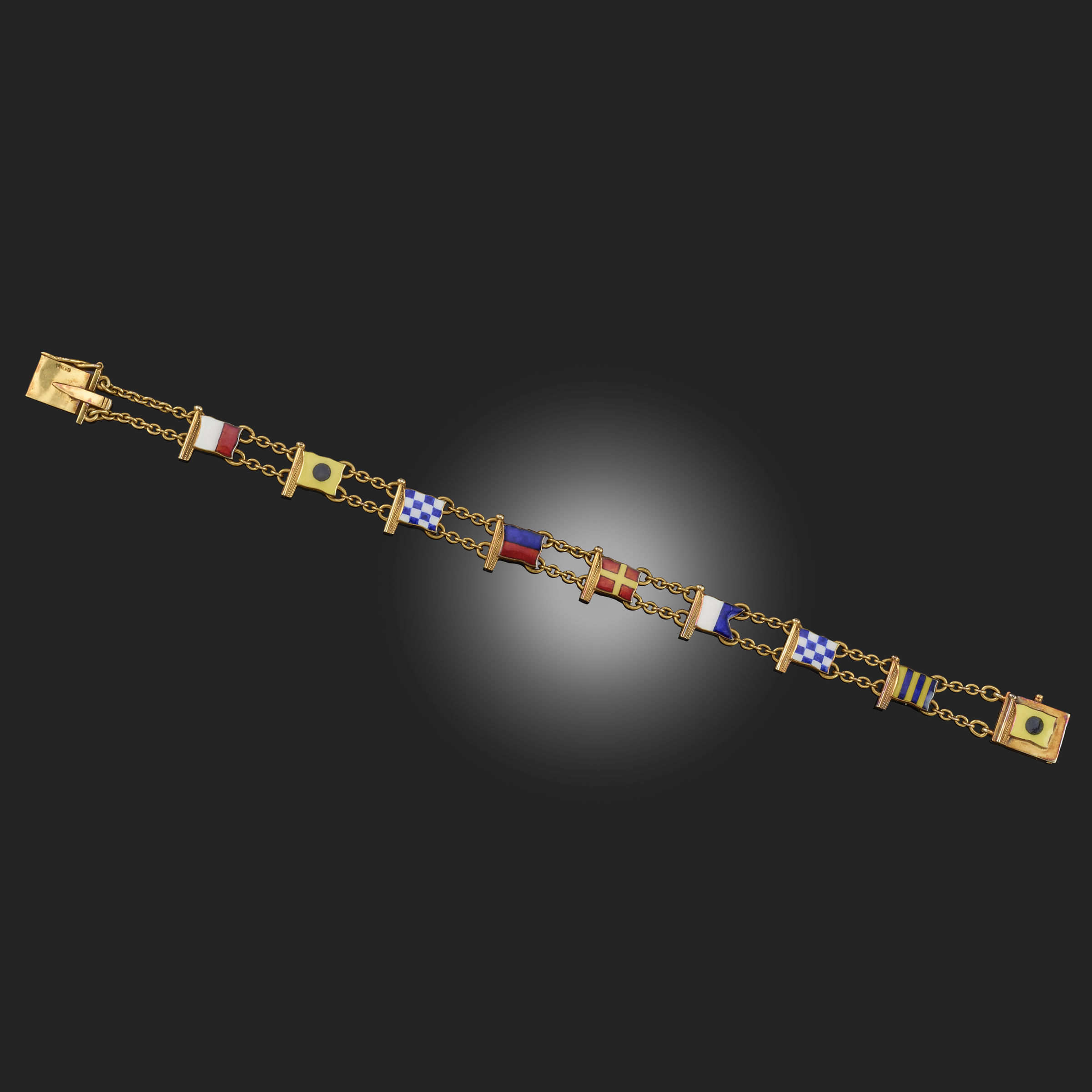 BENZIE, COWES, AN ENAMEL NAUTICAL PENNANT BRACELET, C1957, set with nine enamelled and 9ct yellow gold flag motifs, spelling the word 'HINERANGI', to a two-row circular-link 9ct yellow gold bracelet, signed Benzie, Cowes, with London hallmarks for 1957, each motif stamped 9 and 375, length approximately 19.2cm, gross weight 14g, case