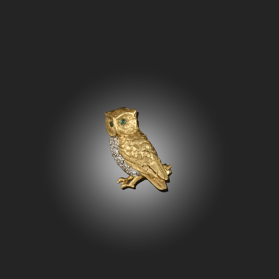 A DIAMOND-SET GOLD OWL BROOCH, C1990