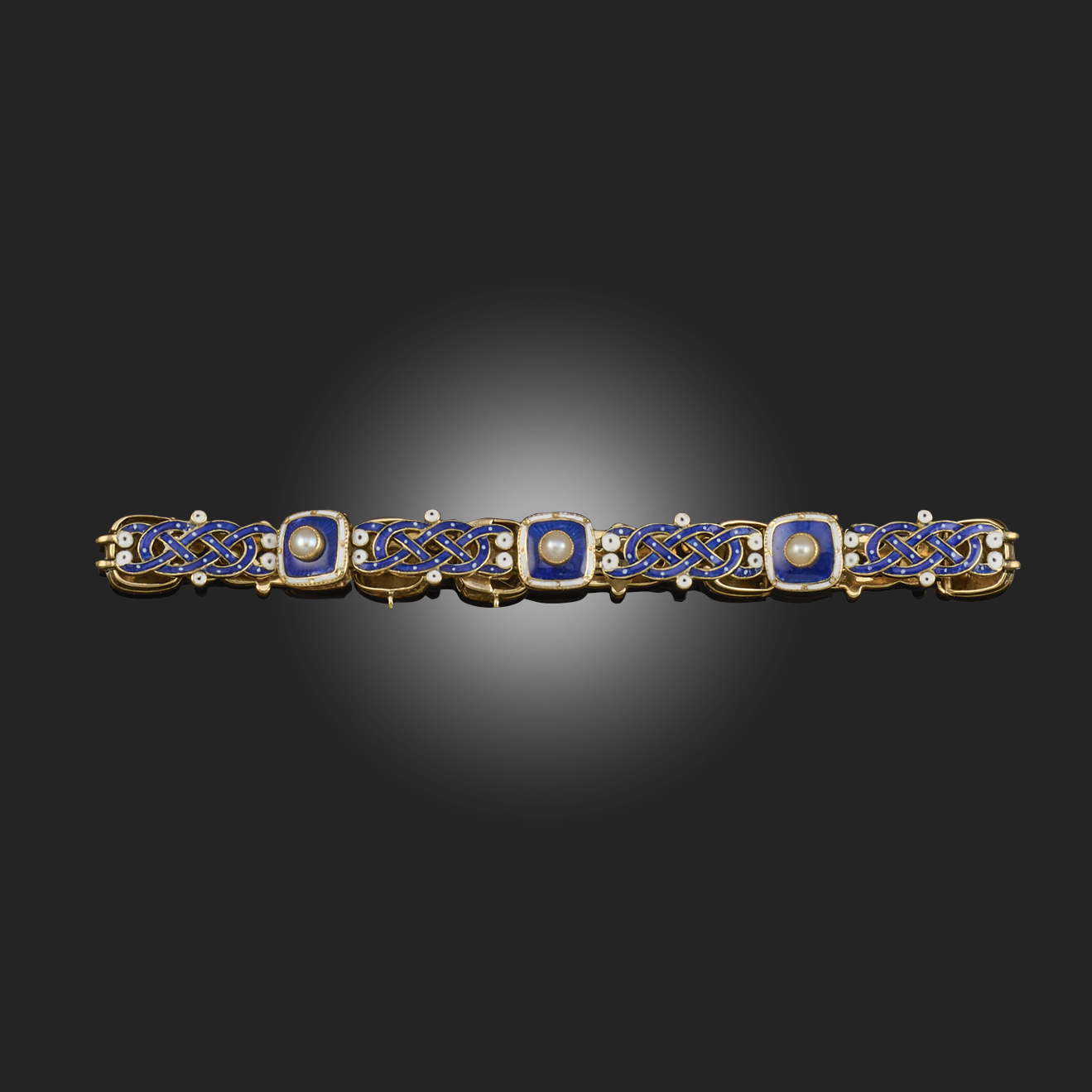 AN EARLY 20TH CENTURY PEARL AND ENAMEL BRACELET