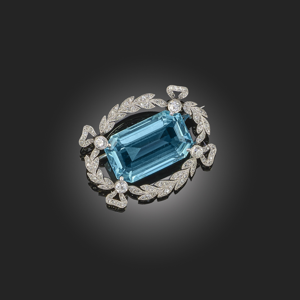 A BELLE ÉPOQUE AQUAMARINE AND DIAMOND BROOCH, centring on a step-cut aquamarine within diamond-set laurel surround quartered with bows in platinum, length 3.6cm